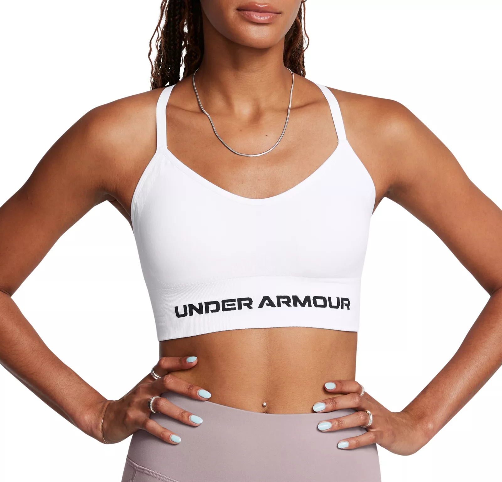 This bra gives you the right support for low-impact activities. It has a longer cut, seamless fit, and adjustable straps for complete comfort. Fit & Design: Delivers strategic support, tailored for low-impact activities like yoga, pilates & hiking Soft knit with engineered ventilation, mapped to the places you need it most Removable cups for enhanced shape & coverage Skinny strap pullover with adjustable cross back & keyhole design Material wicks sweat & dries really fast 4-way stretch material moves better in every direction UPDATED SIZING: Under Armour has revamped their bra sizing so you can find a fit that feels custom to your unique shapecheck the size chart to find your perfect match