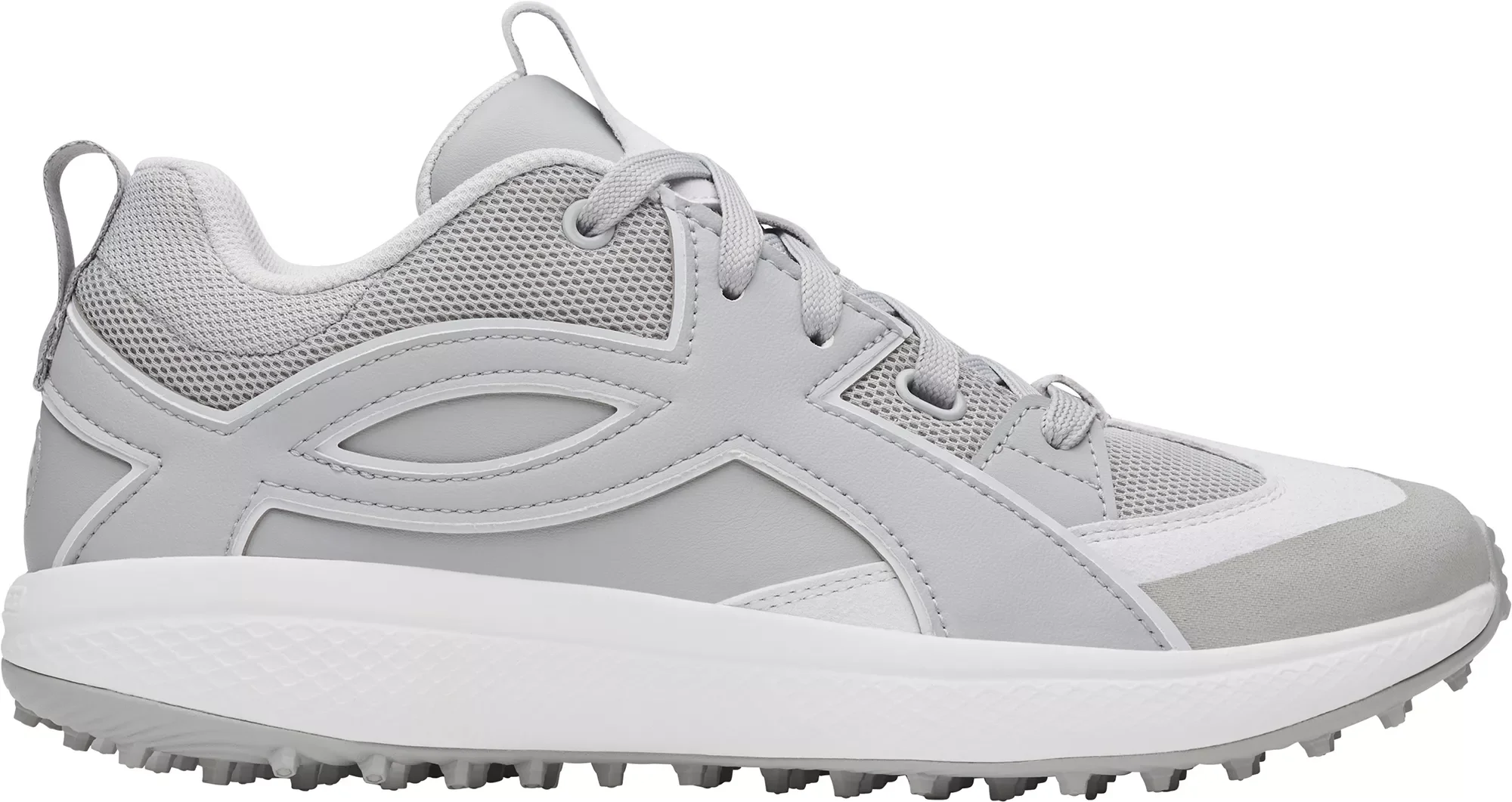 Design: Mix-material upper is breathable and comfortable Strategic textured leather and reinforced panels for added durability and structure where you need it Suede overlay on toe box for added durability with an elevated look and feel Front and back pull tabs for easy on/off In-Shoe Comfort: Charged Cushioning® midsole converts impact into explosive speed & power on the diamond Durability & Traction: Rubber outsole with mini-lugs for incredible grip & traction on artificial turf & dry natural fields Additional Details: Weight: 12.38 oz.
