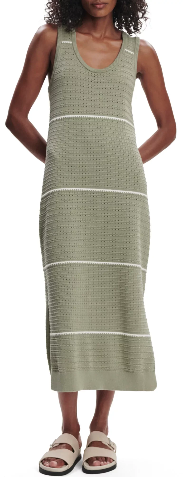 The Scott midi dress is an elegant everyday dress. Inspired by the Dwight, it features the same striped pointelle knit with contrast stitching running through the body. The scoop neckline and side slits give it a contemporary touch. Fit & Design: Designed for everyday wear Scoop neck Side slits Additional Details: Machine wash cool, Do not bleach, Do not tumble dry, Iron on low, Wash with similar colors