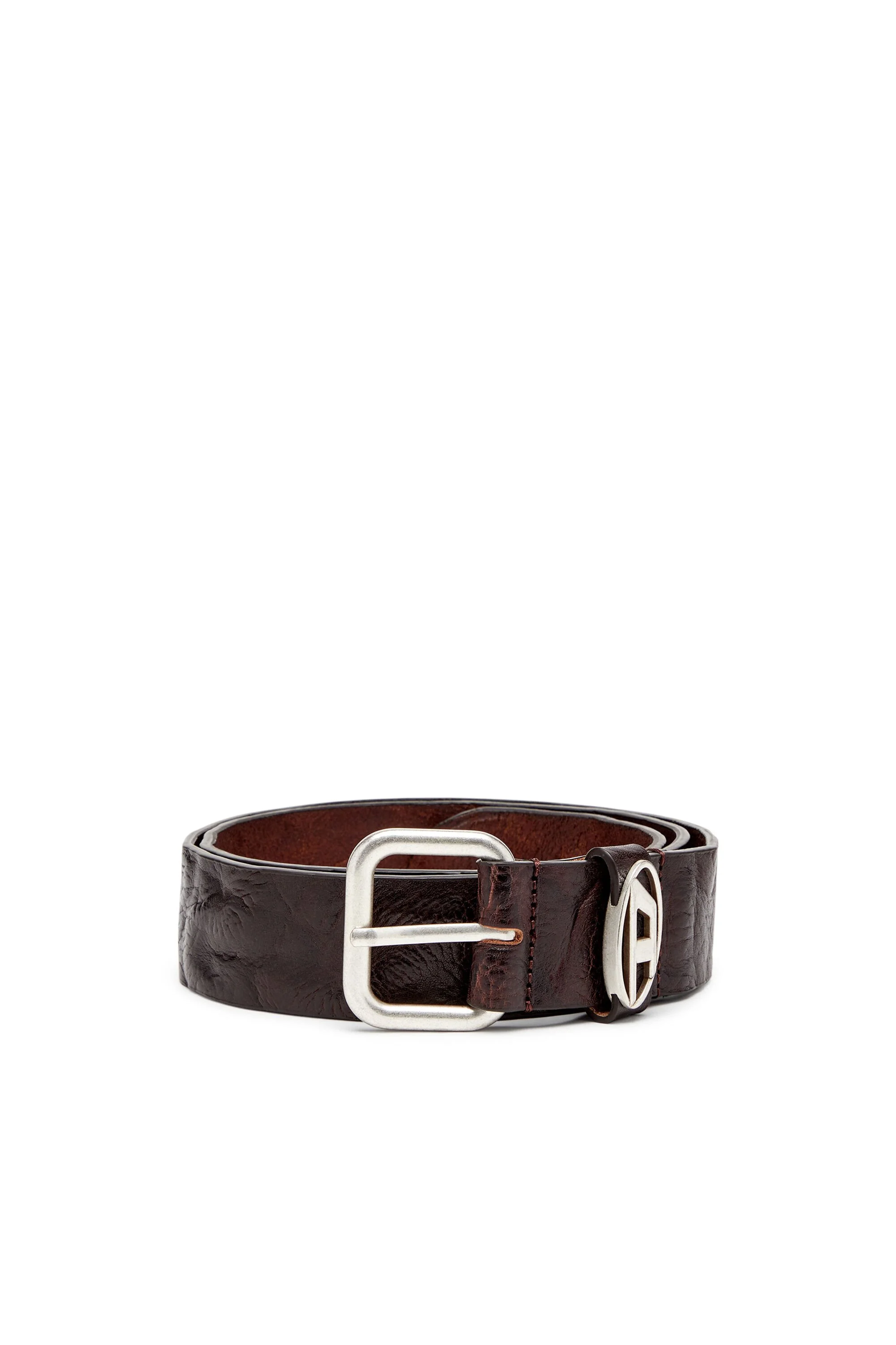 Product Description An all-gender design, this brown belt is crafted from soft leather with a tactile wrinkled finish, and fastens with a polished silver-tone buckle. Note the metal Oval D plaque embellishing the loop. ID: X10314PS681 Materials & Details Composition: 100%Cow Leather