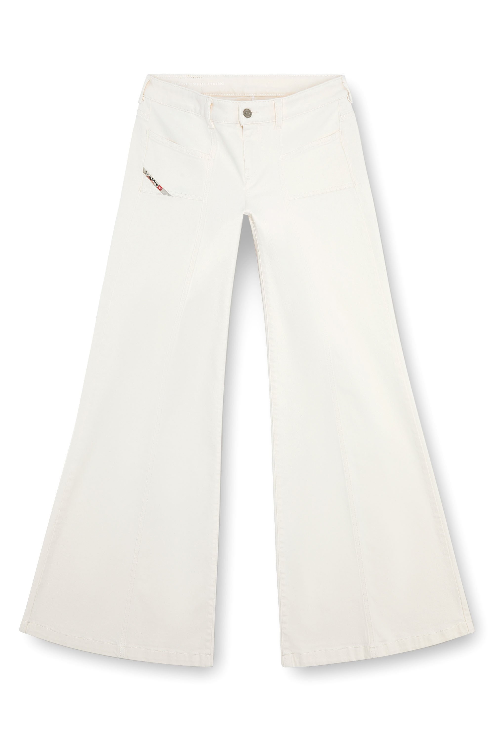 Product Description Flared style with a regular waist, inspired by the dance club looks from the '70s. The front pockets nod to the iconic "Hush" Diesel jean. Featuring a clean white finish, this slightly stretchy comfort denim is part of the DNA selection of iconic and essential washes. It's crafted using organic cotton. ID: A1280809J68 Size & Fit Model is tall 177 cm / 5'10'', the waist measures 60 cm / 23" Check the size chart to choose the correct size. Materials & Details Composition: 99%Cotton 1%Elastane-Spandex Fit: Slim Waist: Mid Leg: Bootcut and Flare Closure: Zip fly