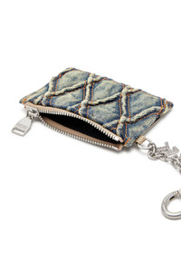 Product Description This women's slim card wallet is made from dirty-wash denim quilted in a diamond pattern. The design is fitted with a practical zipped pouch for coins, and a contrasting reverse with multiple card slots. The short chain is adorned with crystal-encrusted logo letters. ID: X10417P5570 Materials & Details Composition: 50%Cotton 50%Polyurethane 3 card slots Zipped sectionChain and snap-hook