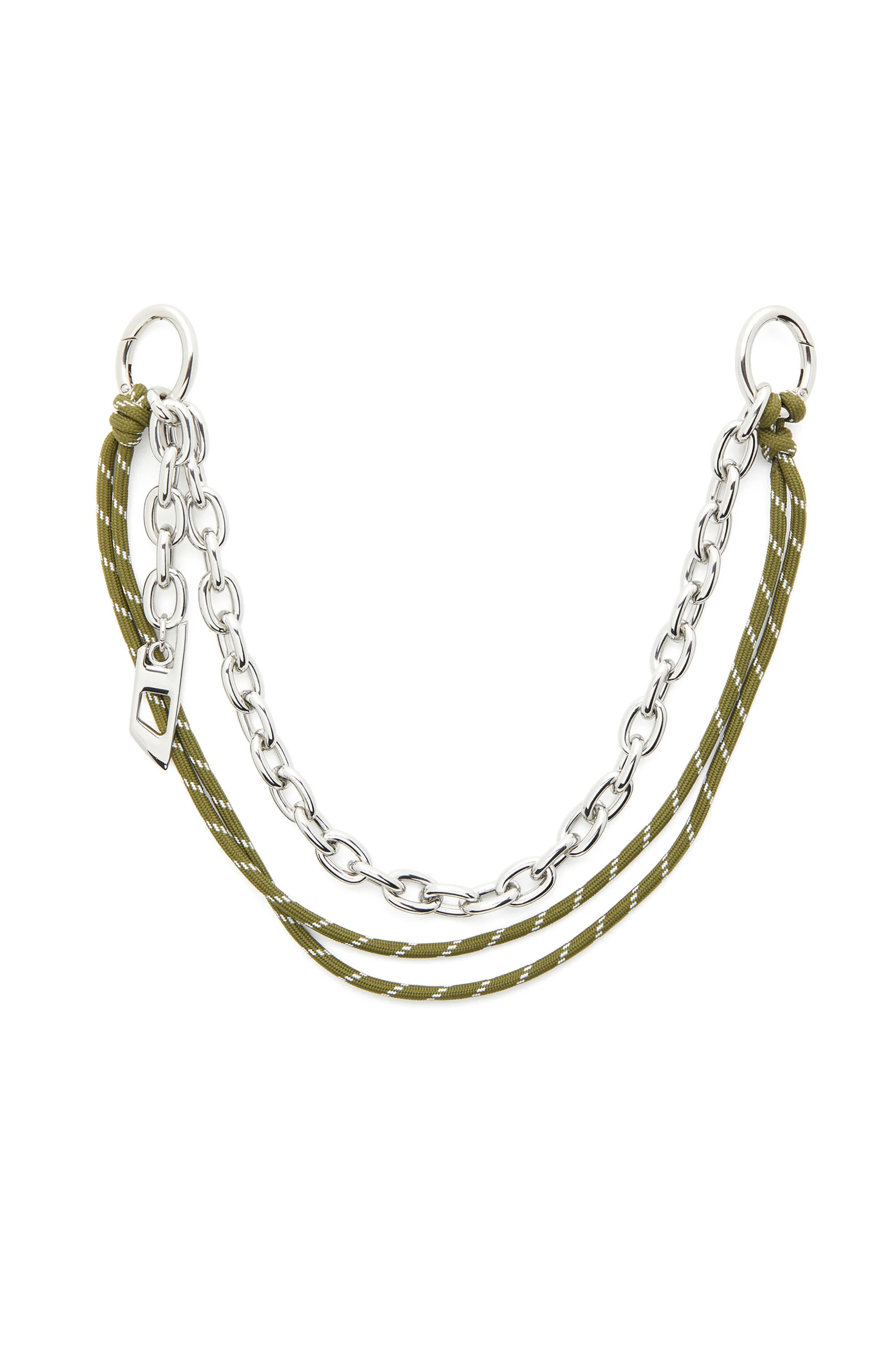 Product Description Charm designed with a combination of metal chain and technical cord, featuring a D-shaped logo pendant. The two round snap hooks ensure versatile attachment to bags, keys, or accessories, lending a signature Diesel touch. ID: X10800P9133 Materials & Details Composition: 40%Aluminium 30%Polyester 25%Zinc 5%Iron Rope and metal chain Double ring-clasp fastening D shaped pendant