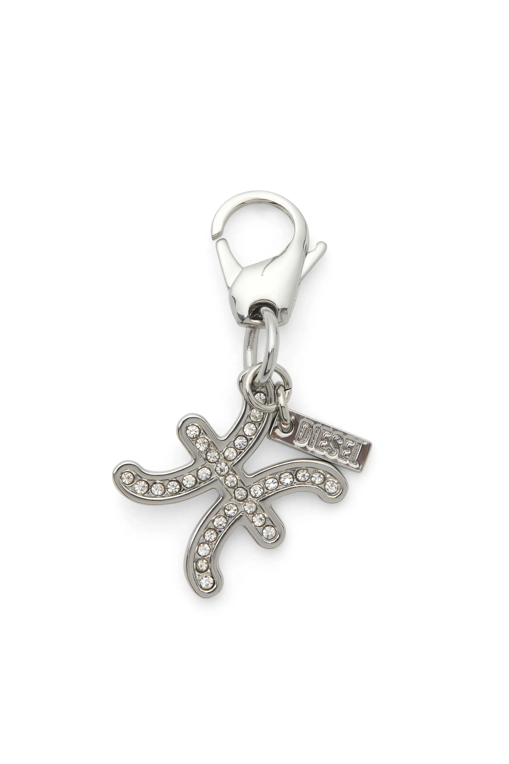 Product Description Charm in polished metal shaped like the Pisces zodiac sign, with rhinestone embellishments. Complete with a practical snap hook, it can be used both as a keyring and as a bag charm. ID: X10797P9132 Materials & Details Composition: 50%Zinc 40%Steel 10%Iron Pendant with lobster clasp Diesel logo tag