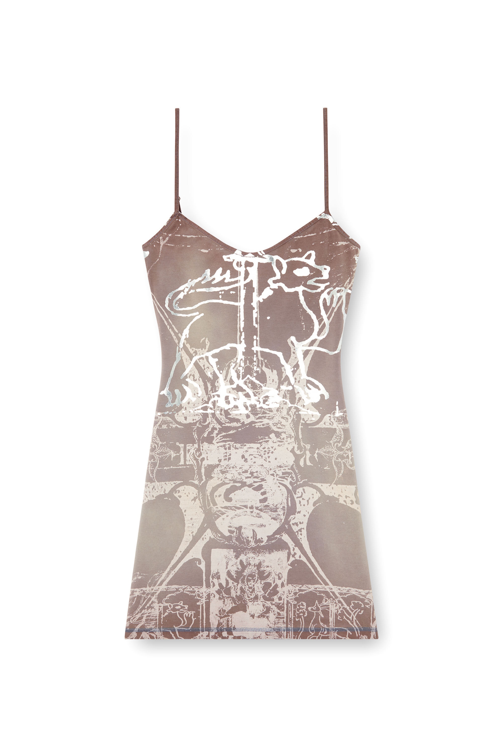 Product Description This mini dress with spaghetti straps is built for a slim fit from stretch organic cotton jersey. The digital artwork on the front riffs off medieval artwork, highlighted on the top in shiny foil detailing. Finished with an inside-out dye for a worn look. ID: A195870DEBZ Size & Fit Model is wearing a size S and is 175 cm / 5'7'' Check the size chart to choose the correct size. Materials & Details Composition: 95%Cotton 5%Elastane-Spandex Slim fit Adjustable straps