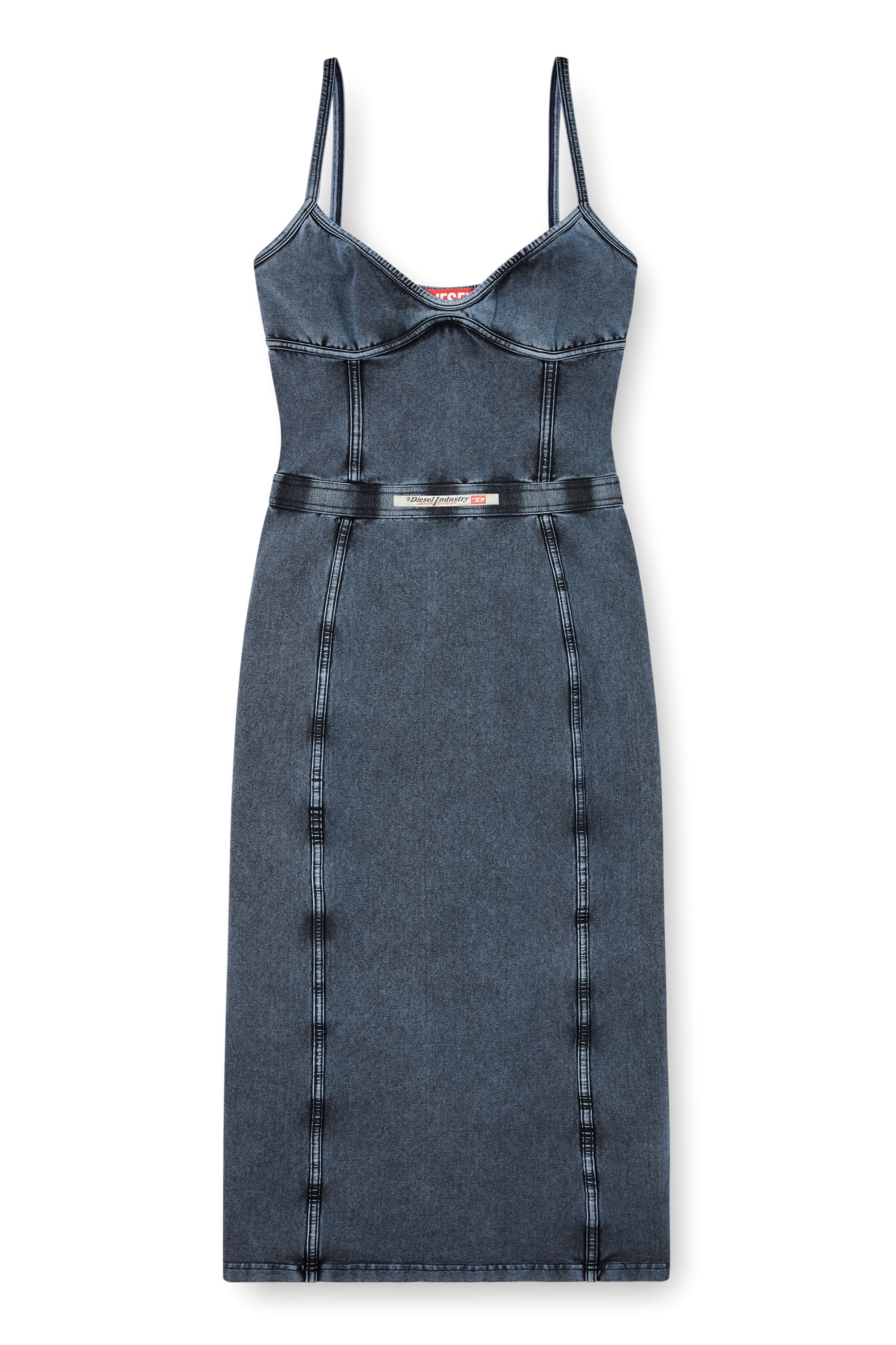 Product Description Sculpting the body with a slim panelled silhouette, this stretch jersey dress is treated and dyed to mimic the look of faded indigo denim. An elasticated waist cinches in the figure, embellished with a heat-transfer Diesel label. ID: A183580KIBY Size & Fit Model is wearing a size S and is 175 cm / 5'7'' Check the size chart to choose the correct size. Materials & Details Composition: 93%Cotton 7%Elastane-Spandex, Elastic 81%Cotton 11%Polyester 8%Elastane-Spandex Slim fit