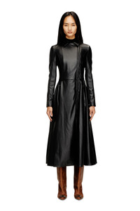 Product Description Sartorial codes meet biker edge in this women’s coat dress – an expression of Diesel’s alternative tailoring. Cut from supple coated fabric to a midi length, it features a shirt collar, zipped pockets and cuffs, and a double-breasted front fastened with an asymmetrical two-way zip. The silhouette is slim through the body before flaring into draped volume. An embossed Oval D logo accents the sleeve. ID: A209120CHAJ Size & Fit Model is wearing an IT size 40 and is 175 cm / 5'7'' Check the size chart to choose the correct size. Materials & Details Composition: 100%Polyester, Coating 100%Polyurethane Slim fit Double-breasted Zip pockets and cuffs Asymmetrical two-way zip closure and hidden snap button Lined at body