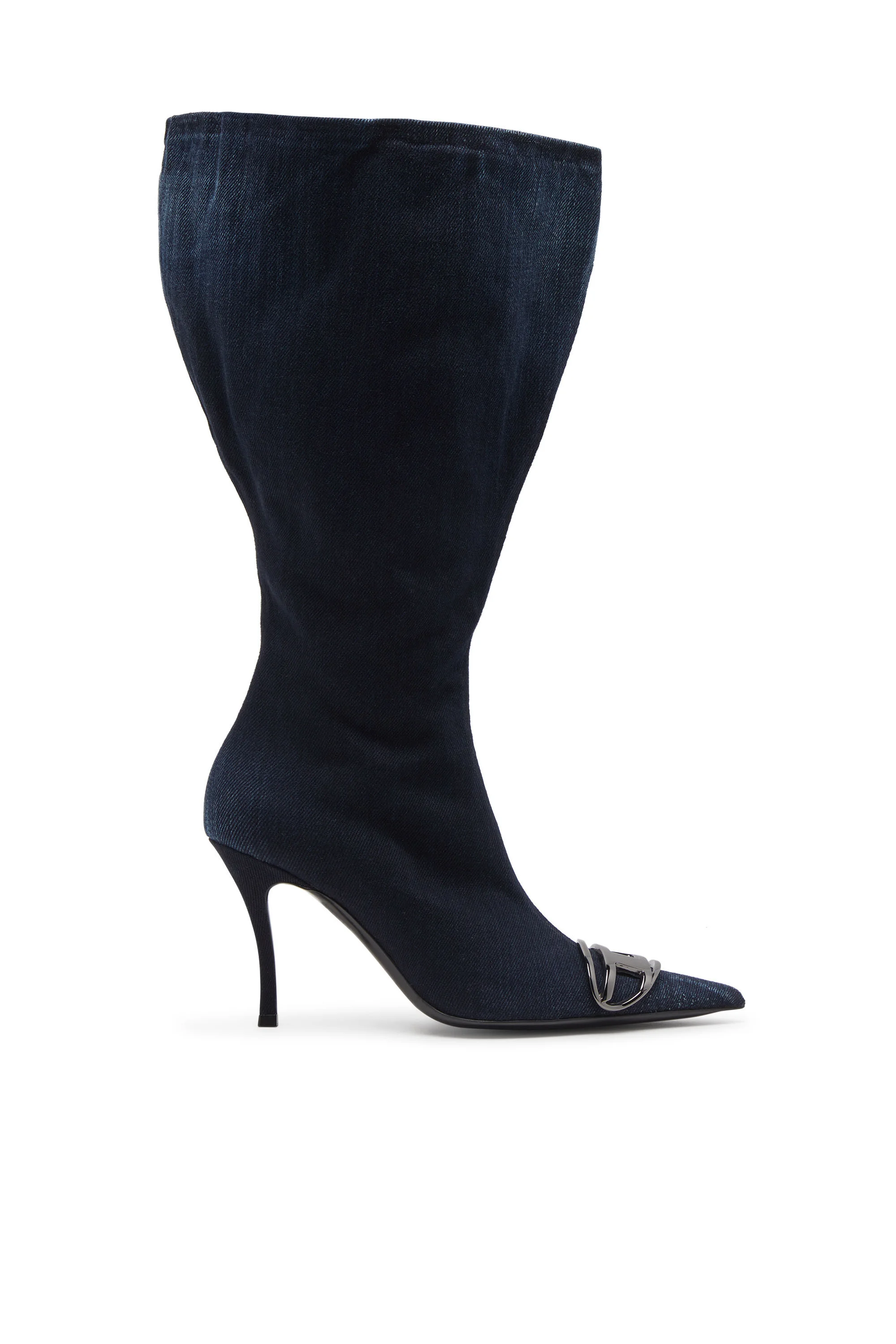Product Description Designed with a wide shaft, this women’s knee-high boot is versatile and easy to wear, complementing barrel-leg jeans such as the 1974 D-ELLZ. Crafted from signature Diesel denim in a dark blue wash, the shoe is characterised by a pointed toe enveloped in a metal Oval D plaque, and elevated by a slim yet wearable 9 cm heel. ID: Y03877P7606 Materials & Details Composition: 100%Cotton Side zip 9 cm heel