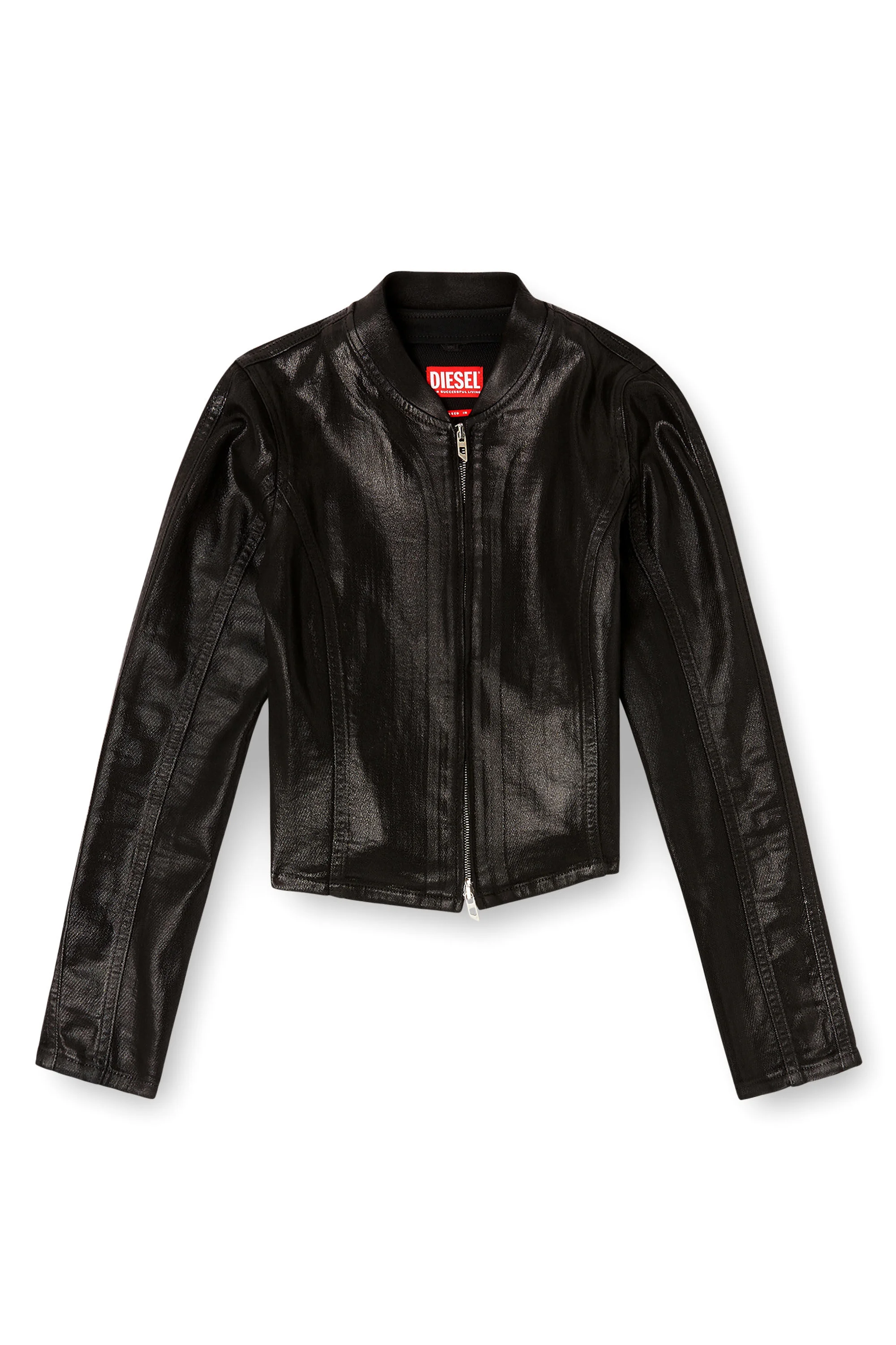 Product Description This women's jacket is cut to a close-fitting silhouette with slightly rounded shoulders, a cropped hem, and round buttoned collar. The fabric is treated with multiple layers of coating to create an extremely smooth, supple texture, enriched by a black spray application. A final pressing technique lends the garment a distinctive sheen. Part of Diesel's DNA selection of iconic and essential washes, this piece is entirely distressed in Italy. ID: A18977068VD Size & Fit Model is wearing a size S and is 175 cm / 5'7'' Check the size chart to choose the correct size. Materials & Details Composition: 99%Cotton 1%Elastane-Spandex, Rib 95%Cotton 5%Elastane-Spandex Two-way zip closure High collar Unlined