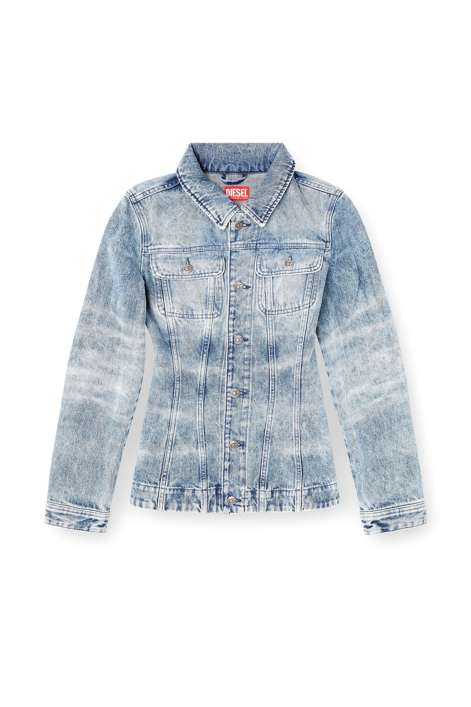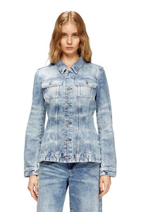 Product Description Playing with archetypes, this women's jeans jacket elevates the classic trucker. Traditional details such as rivet buttons and double stitching anchor the look, while the hourglass silhouette lends an artisanal note. This fix denim is made from cotton and hemp. An advanced laser process creates graphic whiskers and a naturally used effect, enhanced by stone and enzyme washing. The final spray treatment delivers a balanced, light blue finish that reflects the experimental and innovative spirit of the Diesel Runway Show. ID: A21389007DA Size & Fit Model is wearing a size S and is 175 cm / 5'7'' Check the size chart to choose the correct size. Materials & Details Composition: 80%Cotton 20%True Hemp Fall Winter 2025 Runway Show