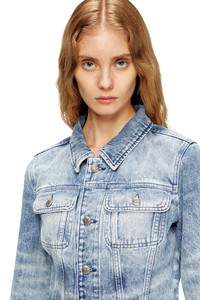 Product Description Playing with archetypes, this women's jeans jacket elevates the classic trucker. Traditional details such as rivet buttons and double stitching anchor the look, while the hourglass silhouette lends an artisanal note. This fix denim is made from cotton and hemp. An advanced laser process creates graphic whiskers and a naturally used effect, enhanced by stone and enzyme washing. The final spray treatment delivers a balanced, light blue finish that reflects the experimental and innovative spirit of the Diesel Runway Show. ID: A21389007DA Size & Fit Model is wearing a size S and is 175 cm / 5'7'' Check the size chart to choose the correct size. Materials & Details Composition: 80%Cotton 20%True Hemp Fall Winter 2025 Runway Show
