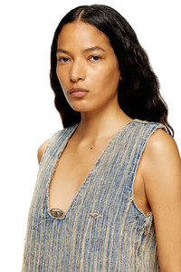 Product Description Sleeveless mini dress with regular fit. Made of cotton featuring distressed effects and raw cut edges. The V-neck is enhanced by the Oval D logo. This jacquard-weave fabric is an example of Diesel's denim know-how, offering a sophisticated take on fix denim. Woven with floating threads, it undergoes a stone wash that creates a striking marble effect. A second wash dyes the threads in a beige tone, adding depth and contrast to the design. The result is a refined yet rugged look, where intentional distressing meets artisanal technique. ID: A190480CMBZ Size & Fit Model is wearing a size S and is 175 cm / 5'7'' Check the size chart to choose the correct size. Materials & Details Composition: 95%COTTON 5%POLYESTER Regular Fit Sleeveless V-neck Distressed effect Raw hem