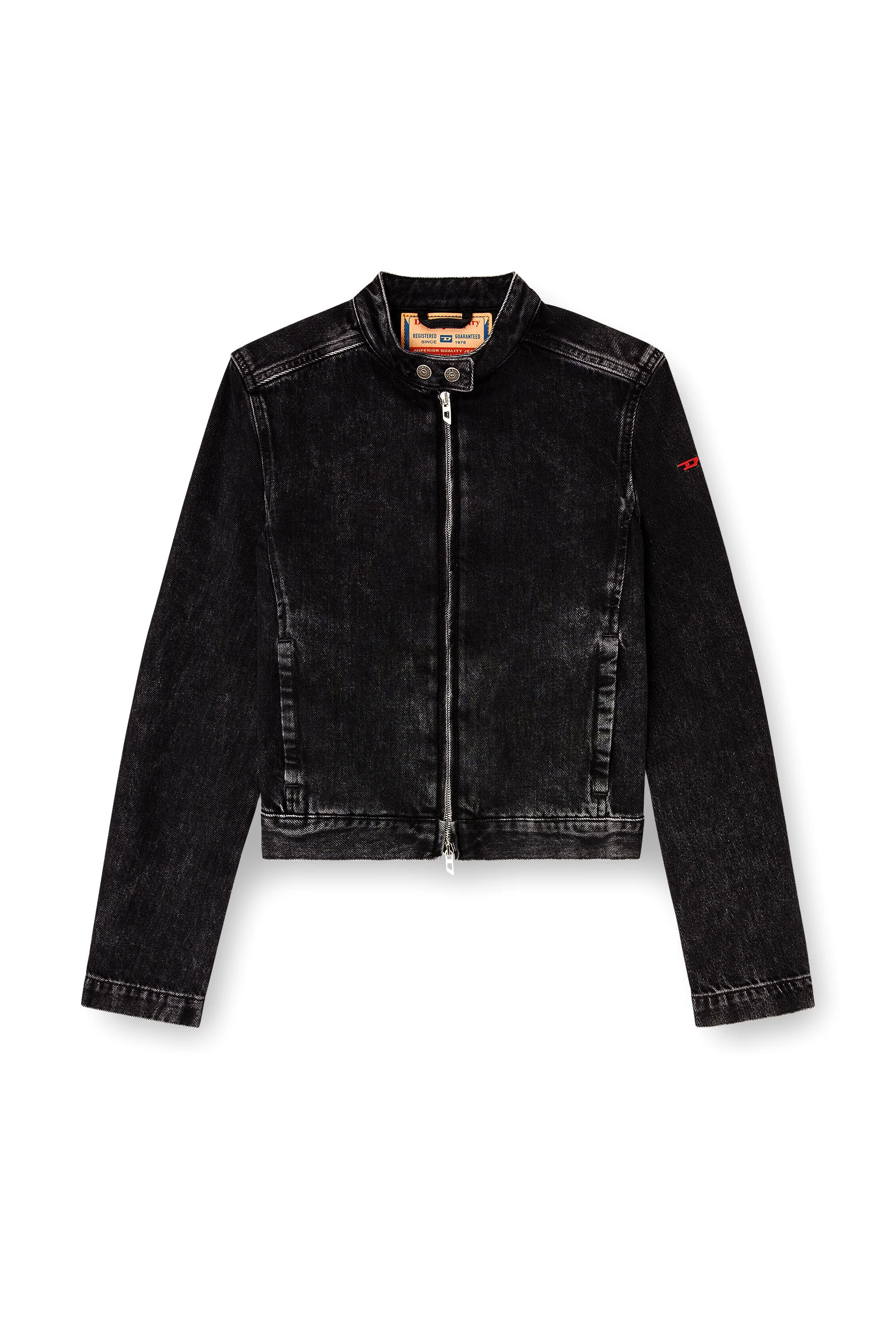 Product Description Informed by biker silhouettes, this women's jacket features a clean, essential aesthetic, detailed with a small D embroidered in red thread on one sleeve. Made from fix denim with a percentage of regenerative cotton and a clean black finish. Part of Diesel's DNA selection of iconic and essential washes. ID: A1343409P09 Size & Fit Model is wearing a size S and is 175 cm / 5'7'' Check the size chart to choose the correct size. Materials & Details Composition: 82%Cotton 18%Lyocell