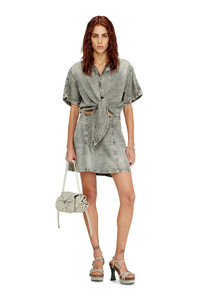 Product Description Mini dress designed to mimic a matching shirt and skirt. The top is knotted at the waist, and features a relaxed fit with short sleeves, a bowling collar and convenient snap buttons. The short skirt sits high and the waist and is cut to an A-line silhouette. The grey fix denim is crafted from organic cotton and TENCEL™ Lyocell for a lightweight, fluid feel. Stonewashed and treated with bleach effects, it features a marbled look and a single stripe down each sleeve for an athletic touch. ID: A21736068UM Size & Fit Model is wearing a size S and is 175 cm / 5'7'' Check the size chart to choose the correct size. Materials & Details Composition: 50%Cotton 40%Lyocell 10%Modal Snap button front Side zip Unlined