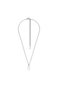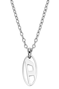 Product Description Diesel's silver-tone necklace features Stainless steel and a Diesel cutout oval D-logo pendant. ID: DX166100DJW Materials & Details Composition: Steel Material: Stainless Steel Closure: Lobster Clasp Finish: Polished Measurements: L 400MM + 100MM x W 8.67MM x H 18MM