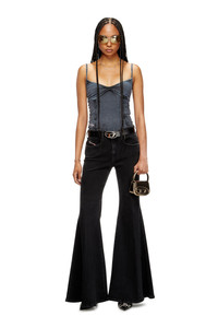 Product Description Flared fit with a low waist and streamlined slim leg that widens dramatically from the knee down. A contemporary interpretation of the archival Diesel D-Ferrenz style, defining details of this jean include the inset fifth pocket, thick double belt loops, and iconic Eagle stitching on the back pockets. Crafted using partially recycled cotton, this comfort denim features a black wash with a clean finish. Iconic and essential, it's part of Diesel's DNA washes. ID: A1788709M69 Size & Fit Model is wearing a size 26 and is 175 cm / 5'7'' Check the size chart to choose the correct size. Materials & Details Composition: 99%Cotton 1%Elastane-Spandex Fit: Flare Waist: Low Wash: Clean Fabric: Comfort Closure: Zip fly Crotch: Regular
