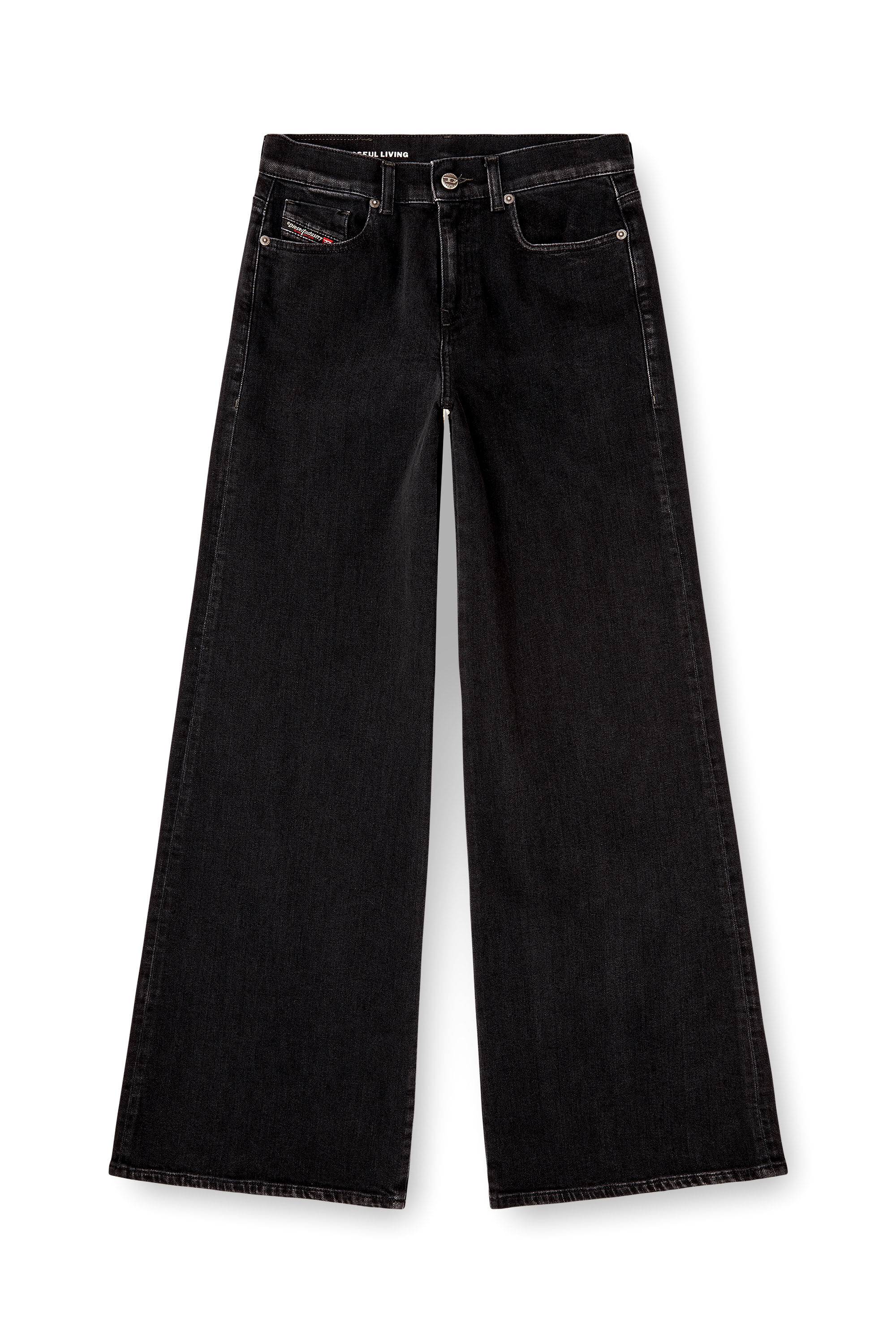 Product Description Flared fit with a medium waist and wide leg. The timeless silhouette is snug at the natural waist, and softens from thigh to ankle. Crafted from slightly stretchy comfort denim in organic cotton, this clean black wash is part of Diesel's DNA selection of iconic, essential pieces. ID: A0362409N89 Size & Fit Model is wearing a size 26 and is 175 cm / 5'7'' Check the size chart to choose the correct size. Materials & Details Composition: 99%Cotton 1%Elastane-Spandex Fit: Flare Waist: Mid Wash: Clean Fabric: Comfort Closure: Zip fly