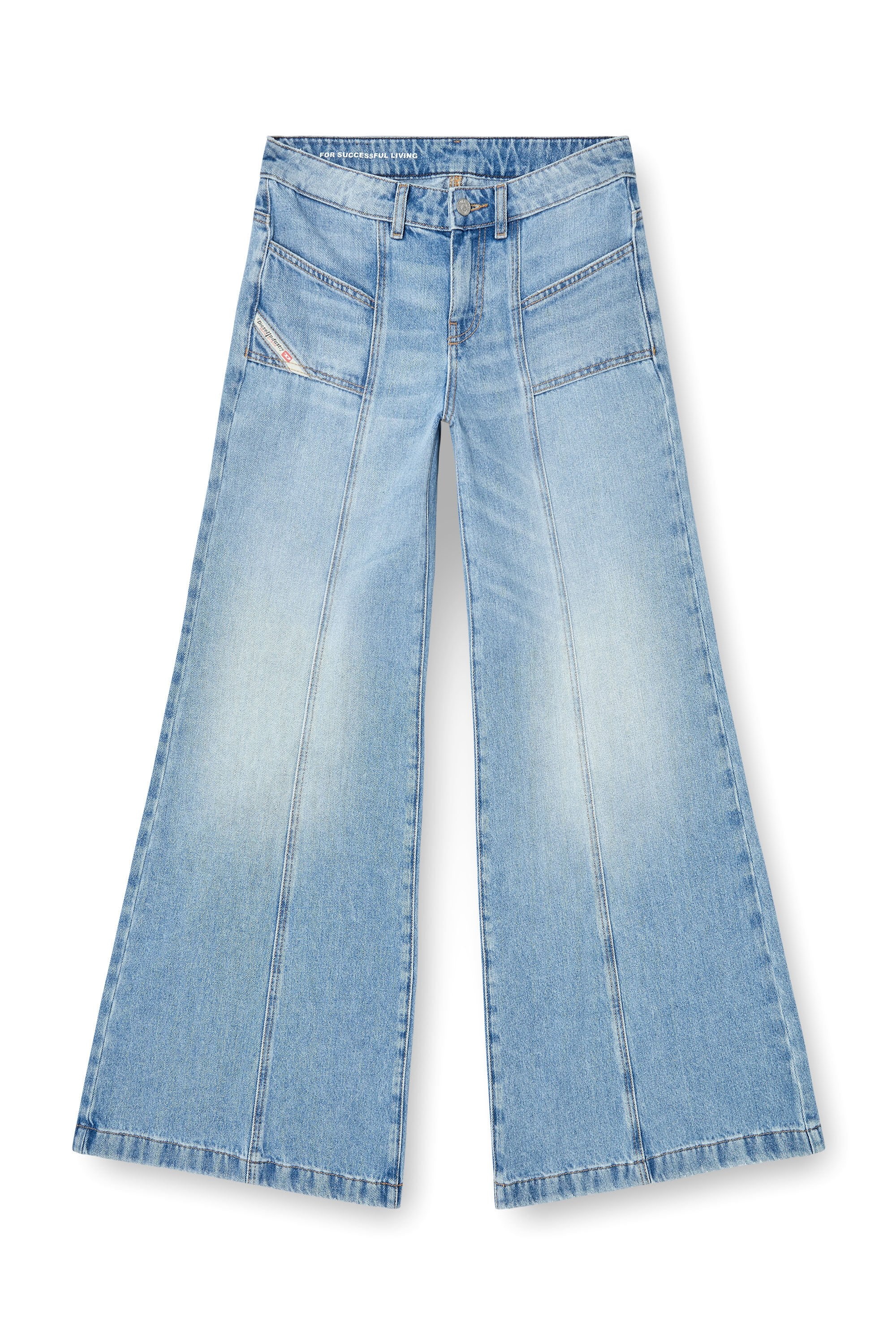 Product Description Flared style with a regular waist, inspired by the dance club looks from the '70s. The front pockets nod to the iconic "Hush" Diesel jean. This light blue fix denim boasts a versatile, clean look. It's crafted using partially recycled cotton and belongs to Diesel's DNA selection of iconic and essential washes. ID: A128080CLBA Size & Fit Model is wearing a size 26 and is 175 cm / 5'7'' Check the size chart to choose the correct size. Materials & Details Composition: 100%Cotton Fit: Flare Waist: Low Wash: Clean Fabric: Non-Stretch Closure: Zip fly