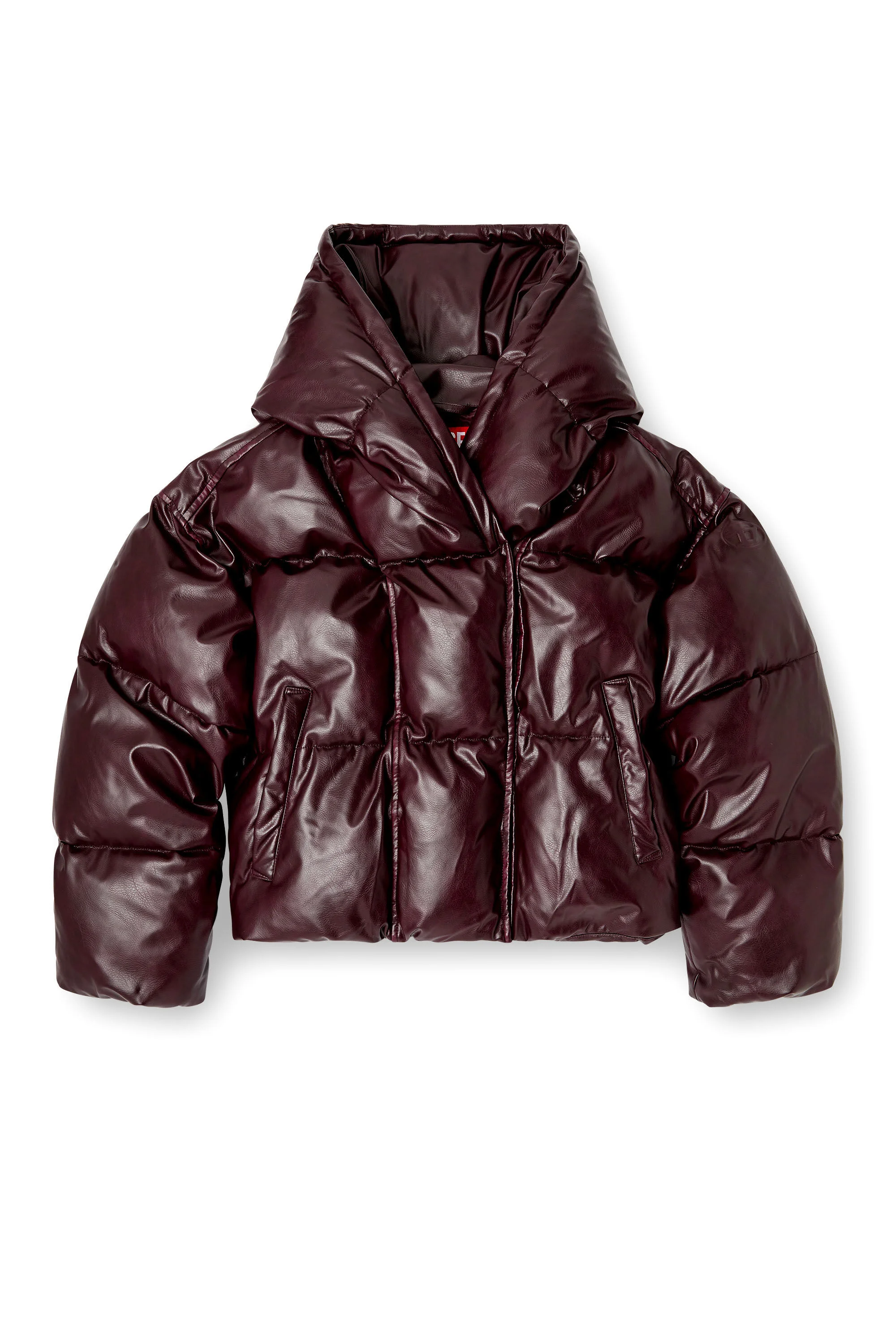 Product Description This women's puffer jacket is crafted from burgundy coated fabric, offering a unique, smooth texture that feels a bit like leather. It features a double-breasted construction with a hidden snap-button closure, a soft hood and drawstring cuffs for warmth. An embossed Oval D detail on the left sleeve subtly completes the design. ID: P017020SPFE Size & Fit Model is wearing an IT size 38 and is 177 cm / 5'9" Materials & Details Composition: 100%Polyester, Coating 100%Polyurethane Hood Hidden snap-button closure Drawstring cuffs Welt pockets Padded