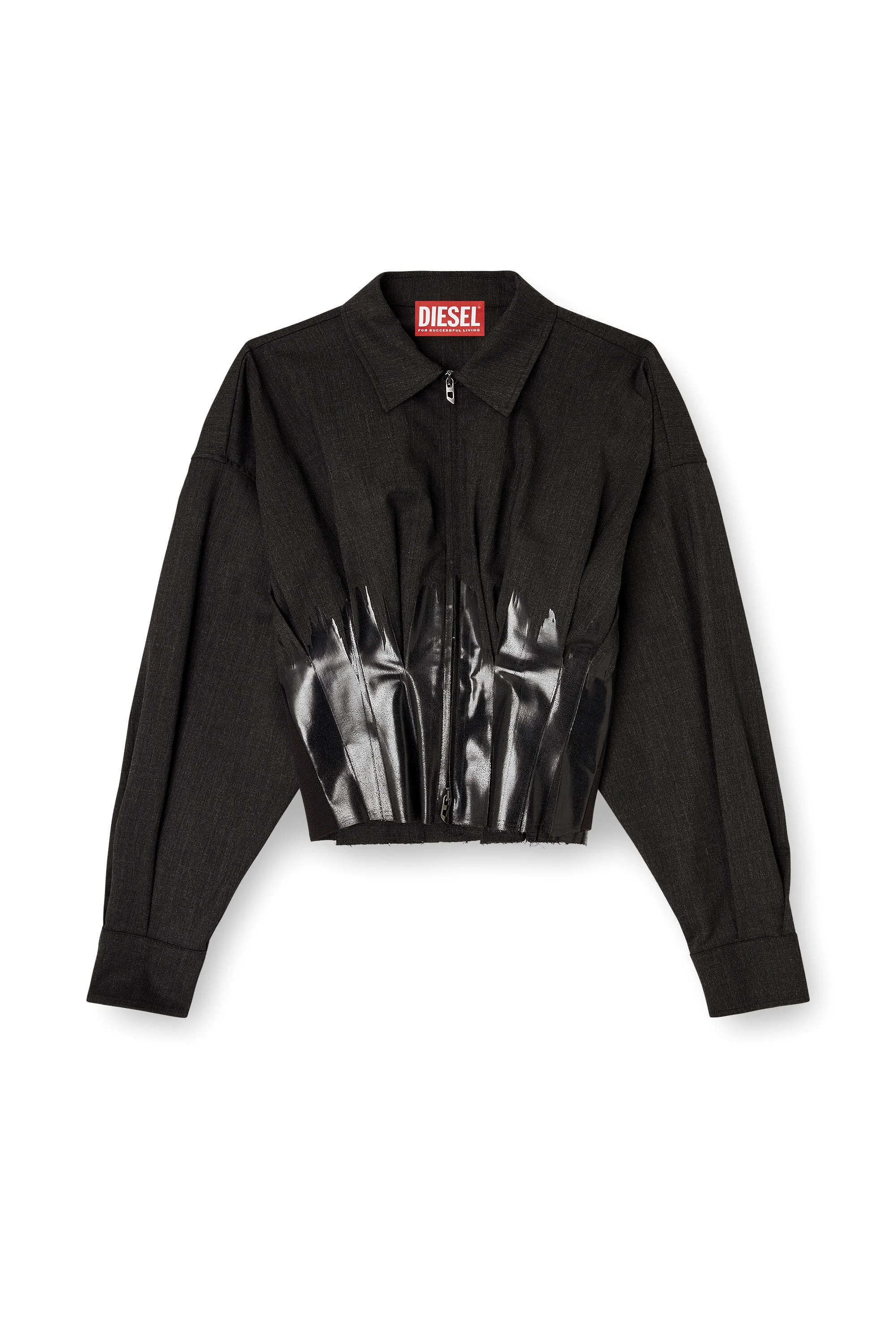 Product Description A subversion of tailoring, this women’s jacket has an intensely worked shirt silhouette. The nipped-in waist is sculpted with coated asymmetrical pleats – a form of radicalized corsetry – offsetting the relaxed, drop-shoulder fit. It’s crafted from stretch virgin wool-blend micro twill, a classic suiting textile, and fastens with a two-way zip. Ribbed-knit inserts on sides add comfort and flex. ID: A209870SLCF Size & Fit Model is wearing an IT size 40 and is 175 cm / 5'7'' Check the size chart to choose the correct size. Materials & Details Composition: 54%Polyester 44%Virgin Wool 2%Elastane-Spandex, Coating 100%Polyurethane, Contrast 100%Polyester Relaxed fit Shirt collar Buttoned cuffs Two-way zip closure