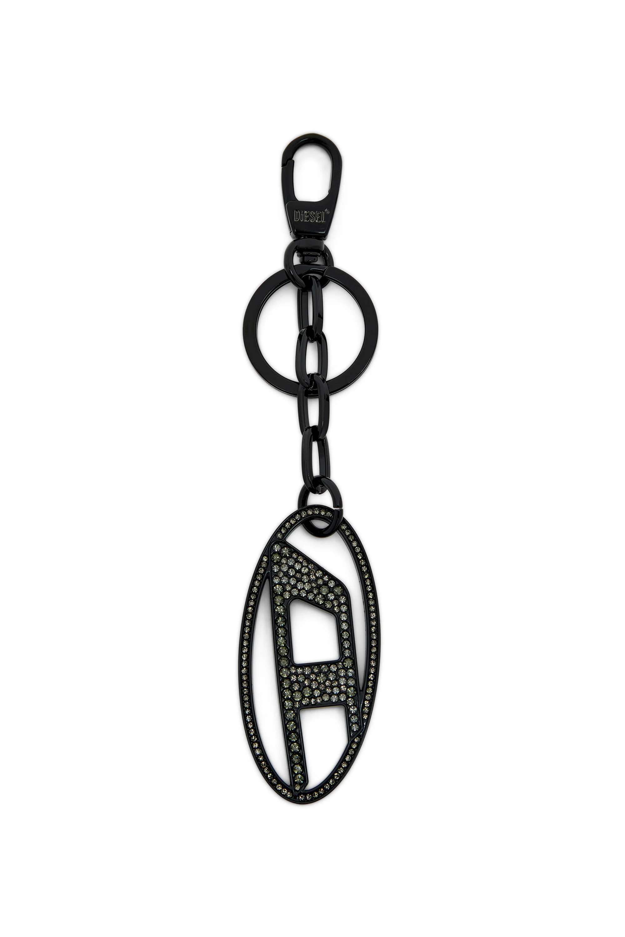 Product Description Cast from silver-tone metal, this women's keyring features the Oval D plaque suspended from a short chain – one side is polished, the other bedecked with crystals in varying sizes. ID: X09691P5607 Materials & Details Composition: 90%Zinc 10%Iron Clasp closure Split ring