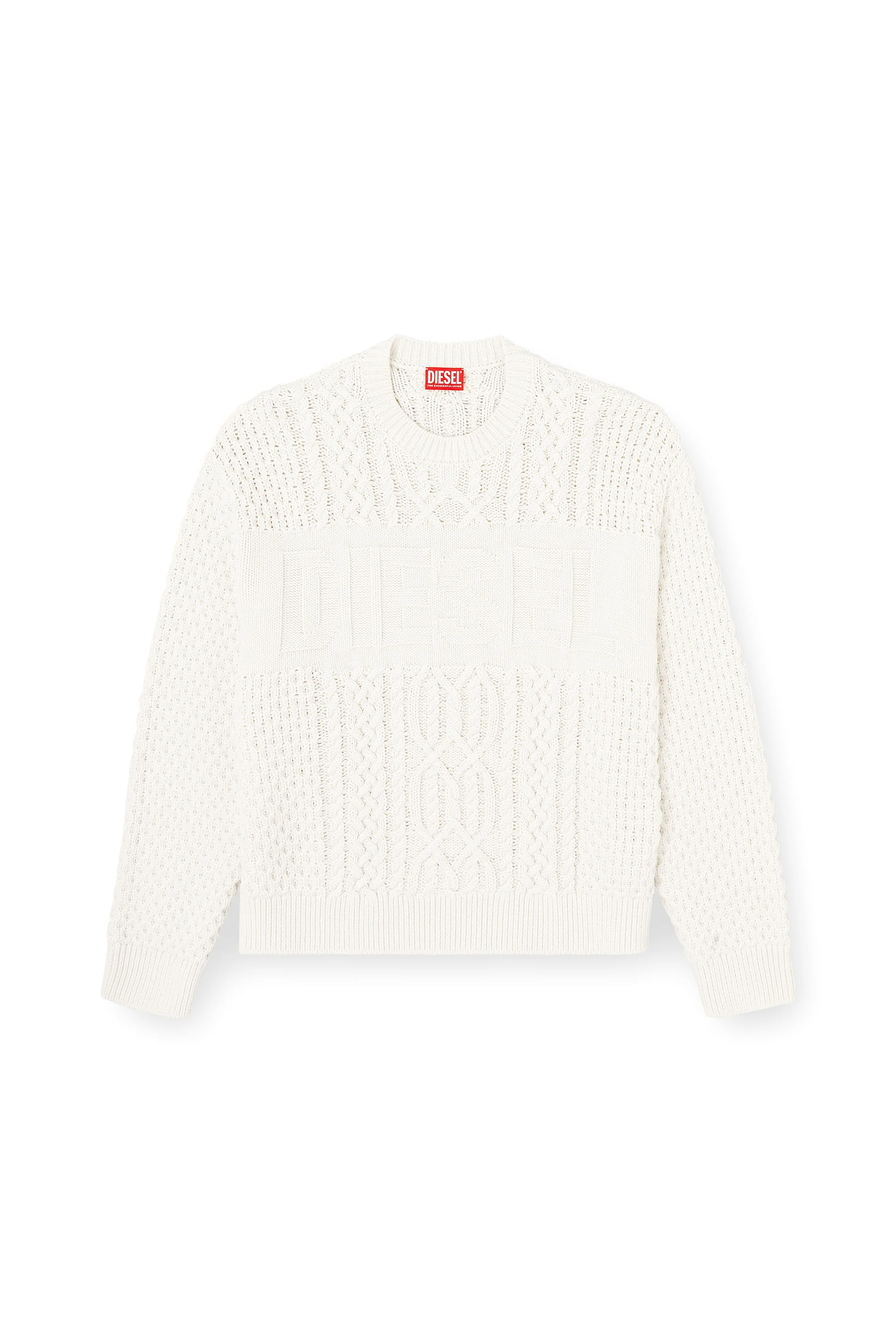 Product Description This men's sweater is knitted using a variety of stitches to create its multi-textural finish, with plenty of cables and Diesel lettering – the logo design is equal parts statement and stealth. Spun from wool and cotton, it has a classic crewneck profile and ribbed trims. ID: A214110PBAC Size & Fit Model is wearing a size L and is 182 cm / 5'10'' Check the size chart to choose the correct size. Materials & Details Composition: 51%Wool 49%Cotton Ribbed trims