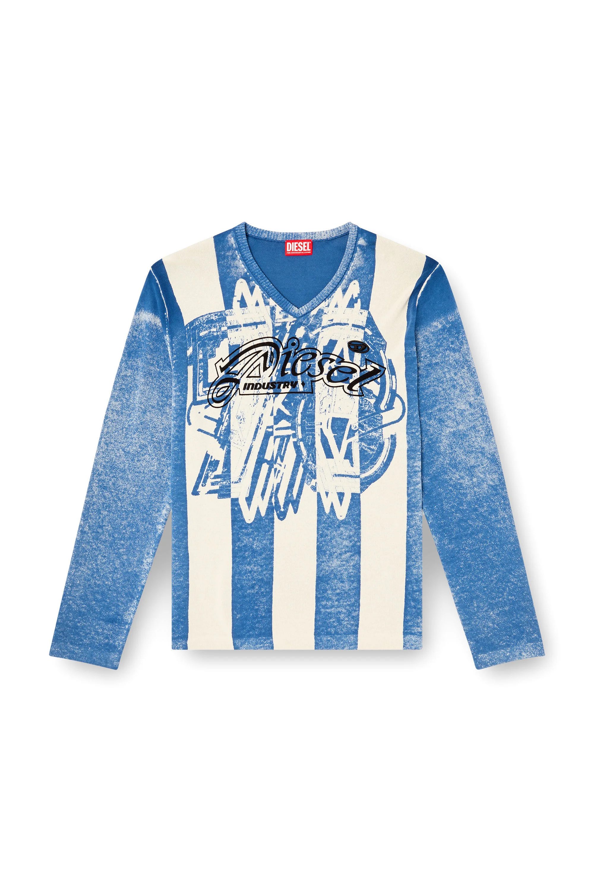Product Description Men’s sweater knitted from organic cotton. A blue and white design with chunky vertical stripes and bold graphics, it has a V-neckline and regular fit. The uneven colour saturation is fully intentional, courtesy of printing on the inside of the garment. Complete with a cut-out embroidered Oval D logo on the chest. ID: A194710NKCJ Size & Fit Model is wearing a size L and is 182 cm / 5'10'' Check the size chart to choose the correct size. Materials & Details Composition: 100%Cotton Regular fit V-neck
