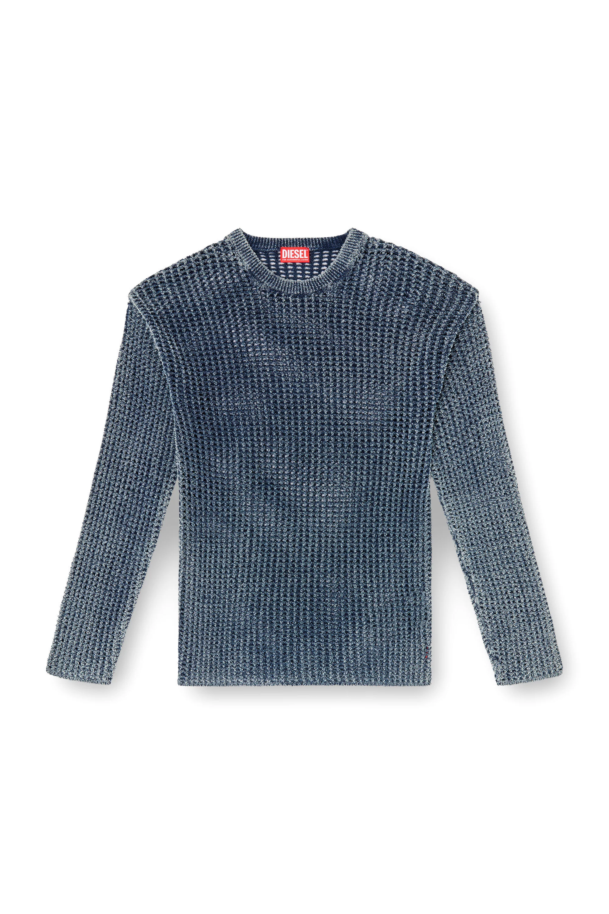 Product Description This men's blue sweater nods Diesel's denim DNA and experimental spirit. A see-through style with a loose fit, it has a chunky, mesh-like construction knitted from a soft and spongy indigo denim yarn containing a high percentage of organic cotton. A stonewashed finish amps up its lived-in denim vibe. ID: A192020CBDP Size & Fit Model is wearing a size L and is 182 cm / 5'10'' Check the size chart to choose the correct size. Materials & Details Composition: 65%Cotton 35%Polyamide-Nylon, Rib 57%Cotton 39%Polyamide-Nylon 4%Elastane-Spandex Loose fit Ribbed neck