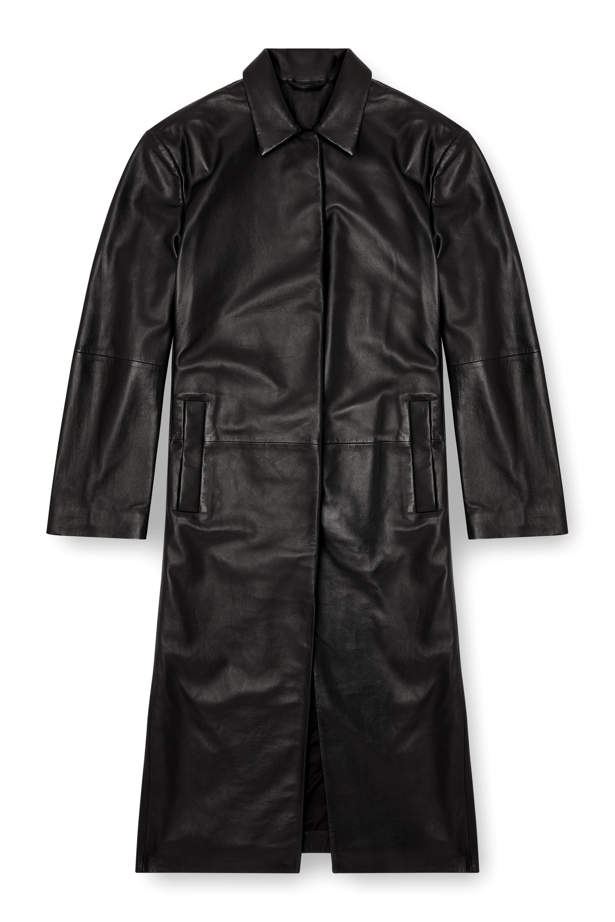 Product Description Expertly tailored from responsibly sourced leather, this women’s black coat has a longline, single-breasted profile with a pointed collar and concealed snap fastenings. It’s lightly structured with shoulder pads and fitted with a smooth logo-jacquard lining. An embossed Oval D logo decorates the sleeve. The relaxed fit means it can styled with a chunkier layer, too. ID: A187850LHBG Size & Fit Model is wearing an IT size 40 and is 175 cm / 5'7'' Check the size chart to choose the correct size. Materials & Details Composition: 100%Sheep Skin Hidden snap-button closure Pointed collarWelt pocketsBack ventLined and lightly padded