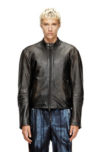 Product Description Men’s biker jacket in responsibly sourced leather. Featuring a snap-fastening stand collar and large elbow patches, this distressed style has a distinct retro flavour brought on by the seemingly age-induced creases and faded areas that reveal the lighter brown undertones of the leather. This garment is lined and finished with chunky metal zip hardware. ID: A193520LIBX Size & Fit Model is wearing an IT size 48 and is 188 cm / 6'2" Check the size chart to choose the correct size. Materials & Details Composition: 100%Sheep Skin Two-way zip closure Snap-button stand collarZipped pockets and cuffsInternal pocketCotton lining