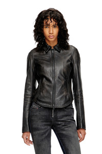 Product Description Women's fitted jacket with a pointed collar and curved hem. Crafted from responsibly sourced leather dyed a deep shade of brown, this distressed style has a broken-in feel, courtesy of fading and scuffs that reveal lighter undertones of the hide. It’s hallmarked with an embossed Oval D logo on the sleeve and fully lined for smooth layering. ID: A195960ILBS Size & Fit Model is wearing an IT size 40 and is 175 cm / 5'7'' Check the size chart to choose the correct size. Materials & Details Composition: 100%Sheep Skin Slim fit Pointed collar, 2 zip pockets and curved hemTwo-way zip closureFully lined