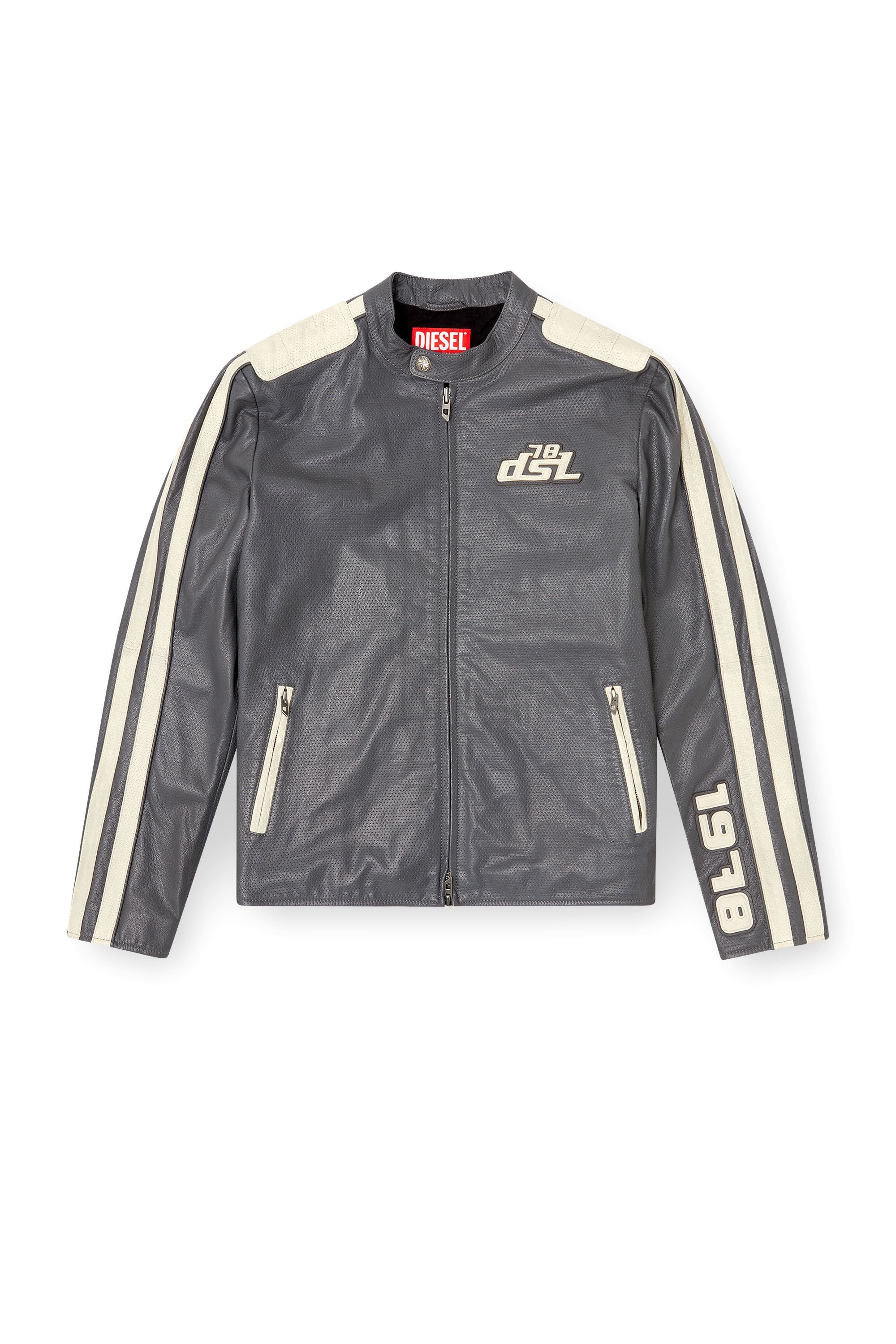 Product Description This jacket updates a sporty cafe race-style silhouette in responsibly sourced perforated leather with a hand-treated finish. A genderless design, it has quilted shoulder panels, zips at the cuffs and a full lining for comfort. The stripes down the sleeves and appliqued leather logo patches lend it a distinct retro moto flavour. ID: A166810AKBA Size & Fit Model is wearing an IT size 48 and is 188 cm / 6'2" Check the size chart to choose the correct size. Materials & Details Composition: 100%Goat Leather Unisex Regular fit Slim snap-button collar, zip pockets and cuffs Two-way zip closure Lined