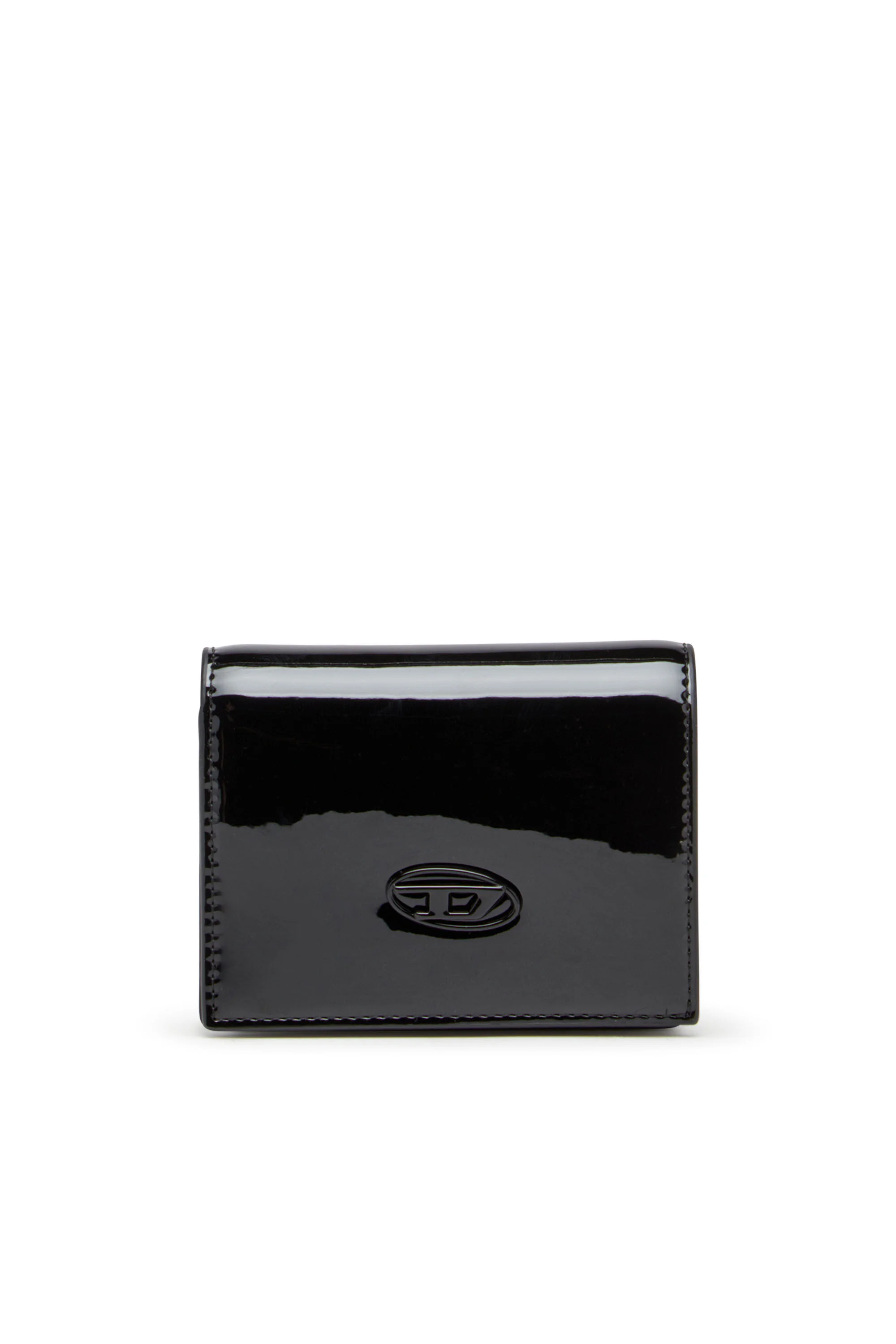 Product Description This compact bi-fold wallet is built from recycled PU with a high-shine finish, and decorated with a tonal lacquered Oval D plaque on the flap. It can hold four cards, has multiple flat pockets for notes and receipts, and a zipped coin section. ID: X10272P6255 Materials & Details Composition: 100%Polyurethane Bi-fold style with snap closure 4 card slots 2 flat pockets Zipped coin pocket