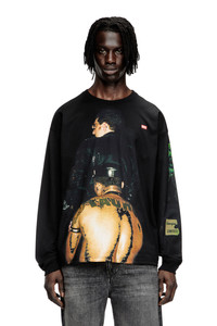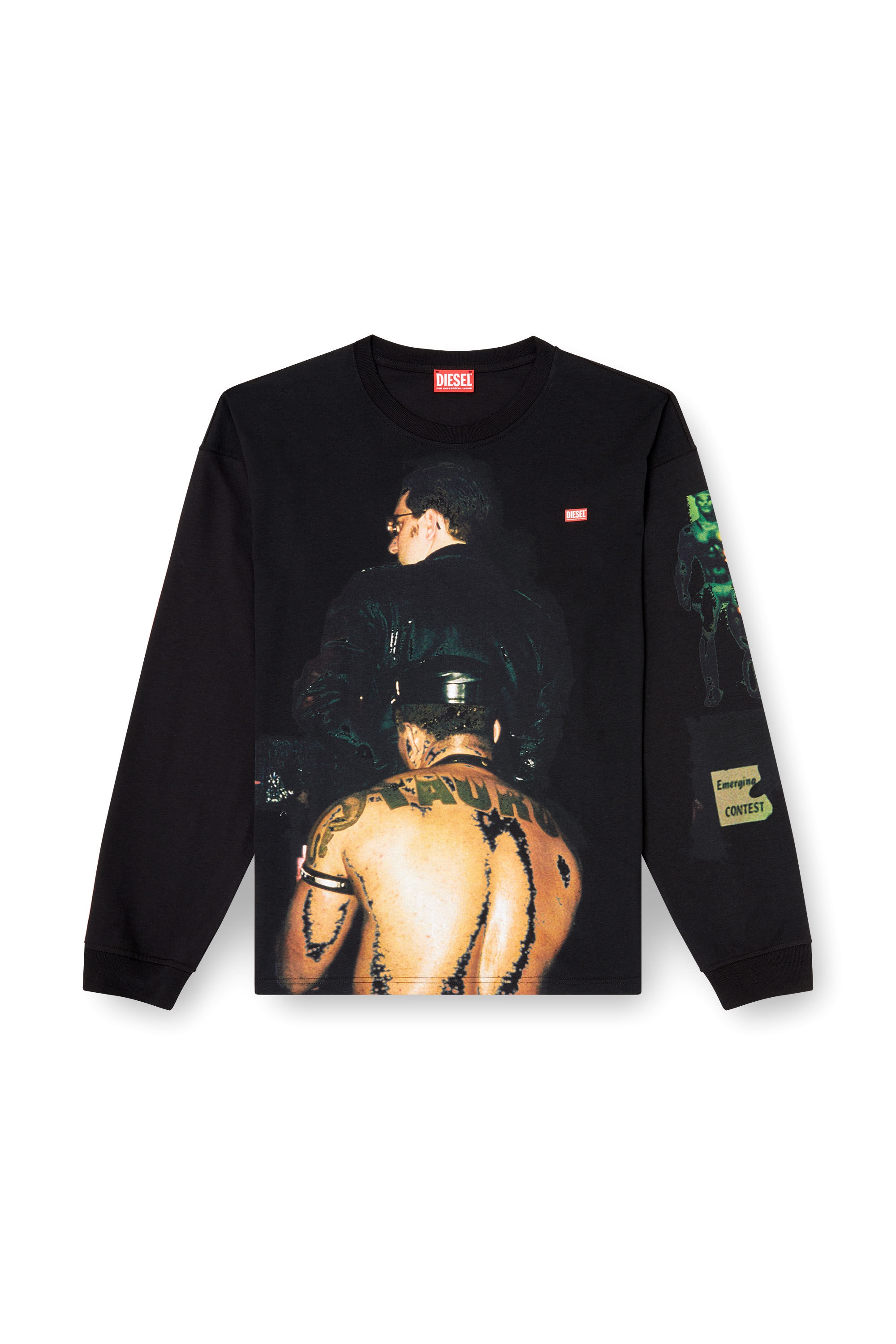 Product Description Diesel unites with the Tom of Finland Foundation on an annual Pride collaboration celebrating the LGBTQIA+ community. Part of the capsule, this long-sleeve T-shirt is cut for a relaxed fit from organic cotton jersey. A printed depiction of work selected from the Tom of Finland Foundation art collection brings the genderless design to life, while a herringbone tape on the back reveals a message from the Foundation’s legendary namesake artist Tom of Finland. ID: P015620SPCK Size & Fit Model is wearing a size L and is 188 cm / 6'2". Model is wearing a size S and is 177 cm / 5'9". Materials & Details Composition: 100%Cotton Diesel x Tom of Finland Foundation Relaxed fit Rubber-touch Diesel logo at chest Tape with printed quote at back Unisex