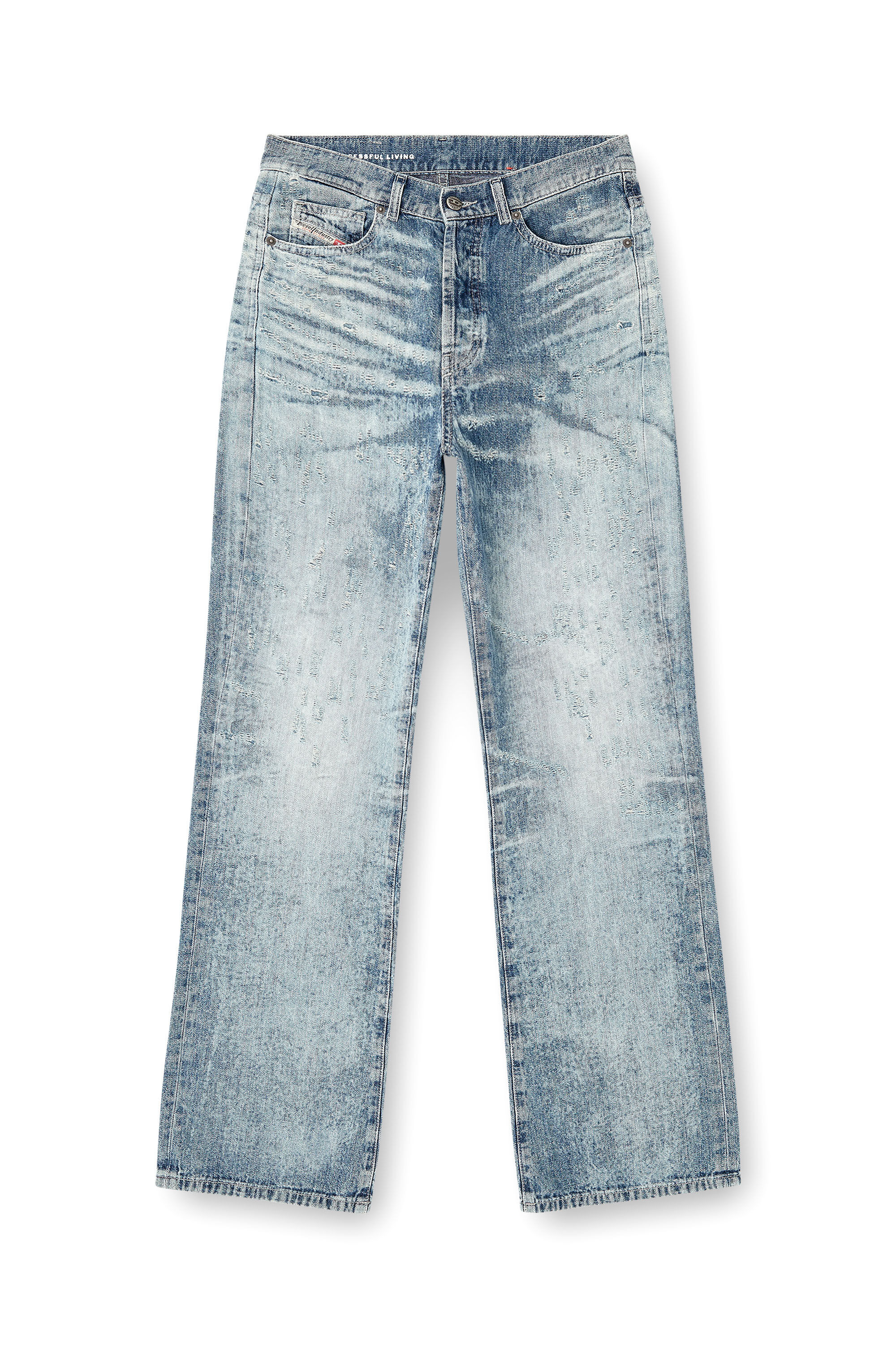 Product Description Regular fit with a straight leg. The waistband sits high on the waist and is designed to create a V-shaped front, tracing a feminine yet comfortable silhouette that embodies classic elegance. Fastened with a button fly. This light blue fix denim is inspired by Japanese honeycomb fabrics. The texture and colour of the jacquard weave are enriched through stone washing, nebulised bleach effects, and laser technology. Distinctive floating threads and natural abrasions emerge during the process, enhancing the unique, distressed finish of this Runway wash. ID: A21359068TY Size & Fit Model is wearing a size 26 and is 175 cm / 5'7'' Check the size chart to choose the correct size. Materials & Details Composition: 100%Cotton Fit: Regular Waist: High Wash: Treated Fabric: Non-Stretch Closure: Button fly Crotch: Regular