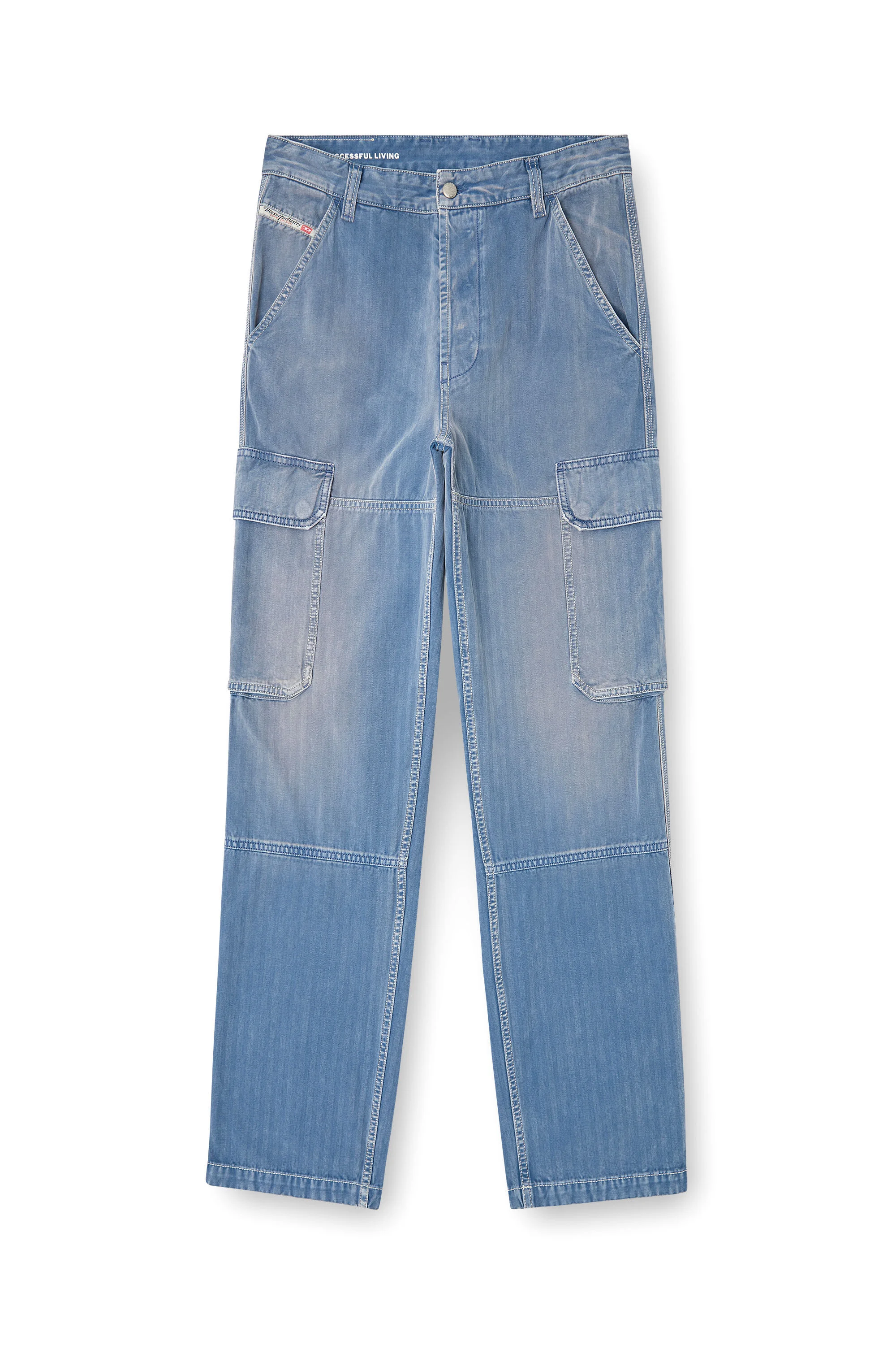 Product Description Regular fit with a medium waist and straight leg. Snap-button cargo pockets and utilitarian details complete the design. Button fly. Designed to lend an edgy twist to everyday "uniform" dressing, this fix denim stands out with a refined herringbone pattern in a soft indigo colour, creating a subtle pinstriped effect. This exclusive wash is part of Diesel's DNA selection, showcasing the brand's heritage and essential style codes. Available only in Diesel flagship stores and on diesel.com. ID: A1629009M93 Size & Fit Model is wearing a size 32 and is 182 cm / 5'10'' Check the size chart to choose the correct size. Materials & Details Composition: 100%Cotton Fit: Regular Waist: Mid Wash: Medium treated Fabric: Non-Stretch Closure: Button fly Crotch: Regular