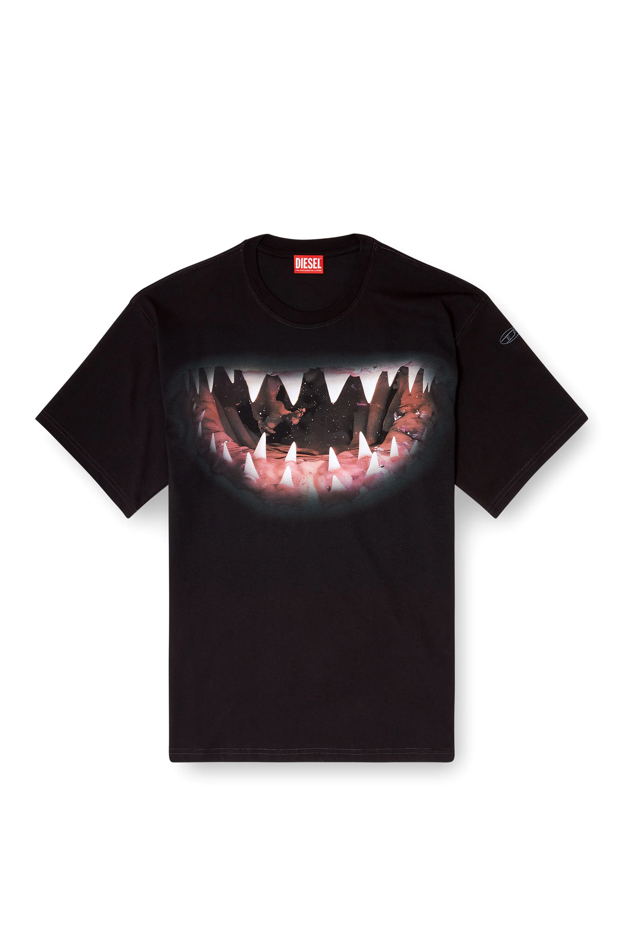 Product Description T-shirt made of cotton with a relaxed fit, featuring a classic round neck and short sleeves. Characterized by a digital print of a shark mouth that adds a unique touch, it has the Oval D logo embroidered on the left sleeve. ID: A196170PLAT Size & Fit Model is wearing a size L and is 182 cm / 5'10'' Check the size chart to choose the correct size. Materials & Details Composition: 100%Cotton Relaxed fit Crew neck Short sleeve Digital print Oval-D embroidery
