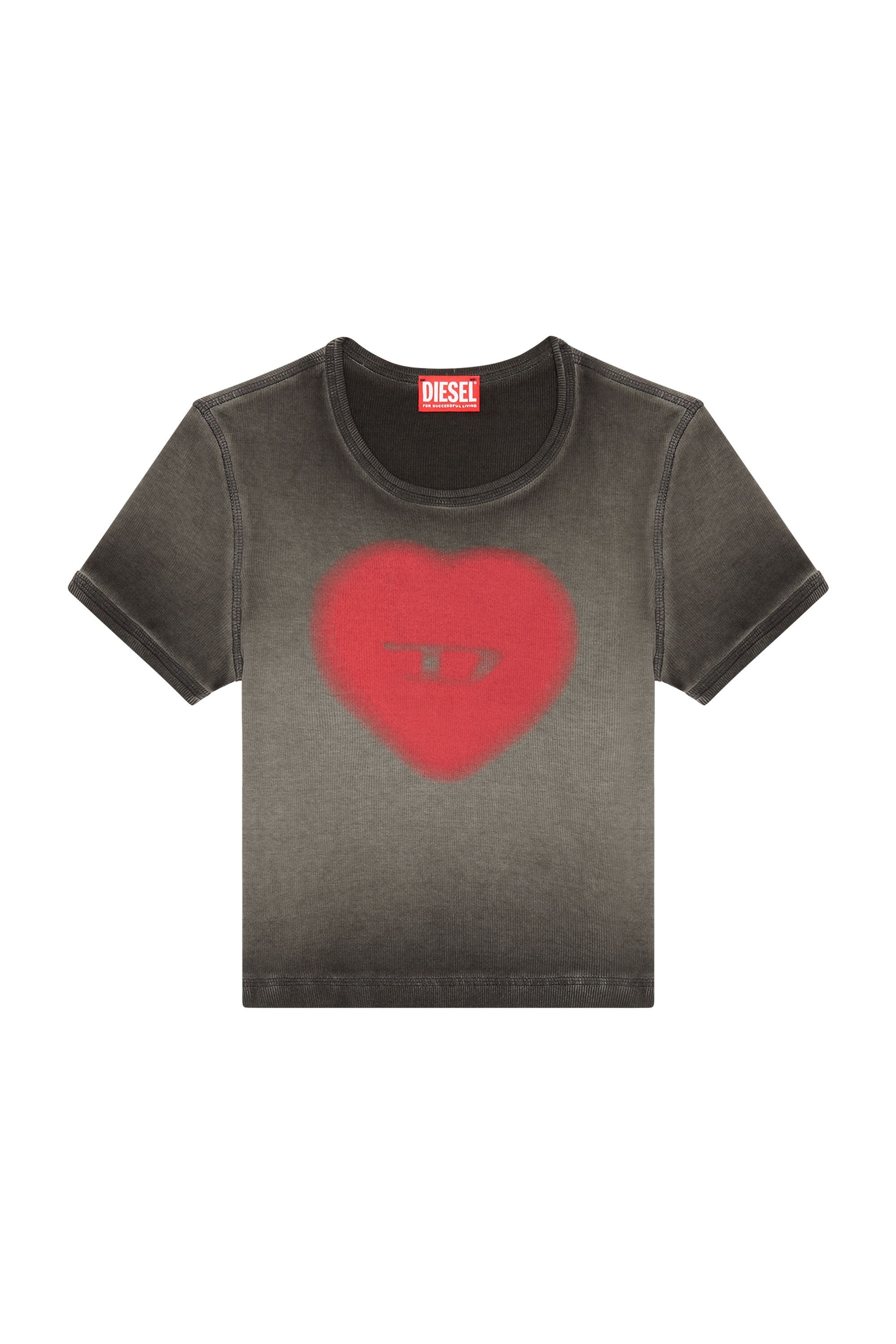 Model is wearing a size S and is 175 cm / 5'7'' Fits true to size, take your normal size. This women's tee is cut from stretch rib cotton that sits close to the body. The D heart logo is printed from the inside to create a watercolour effect. Pigment-dyed whilst inside out for a faded, worn-in look, its skinny silhouette is rounded off with contrast cover-stitching. By buying cotton products from Diesel, you’re supporting responsible cotton production through Better Cotton”.