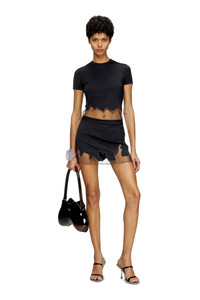Product Description This women's T-shirt features an asymmetric see-through hem that ties in perfectly with the squiggly lines of cord embroidery. Made from black recycled nylon for a stretchy fit that sits close to the body, it's detailed with a metal Oval D on the back. ID: A196100NKCV Size & Fit Model is wearing a size S and is 175 cm / 5'7'' Check the size chart to choose the correct size. Materials & Details Composition: 77%Polyamide-Nylon 23%Elastane-Spandex, Contrast 100%Polyamide-Nylon Slim fit