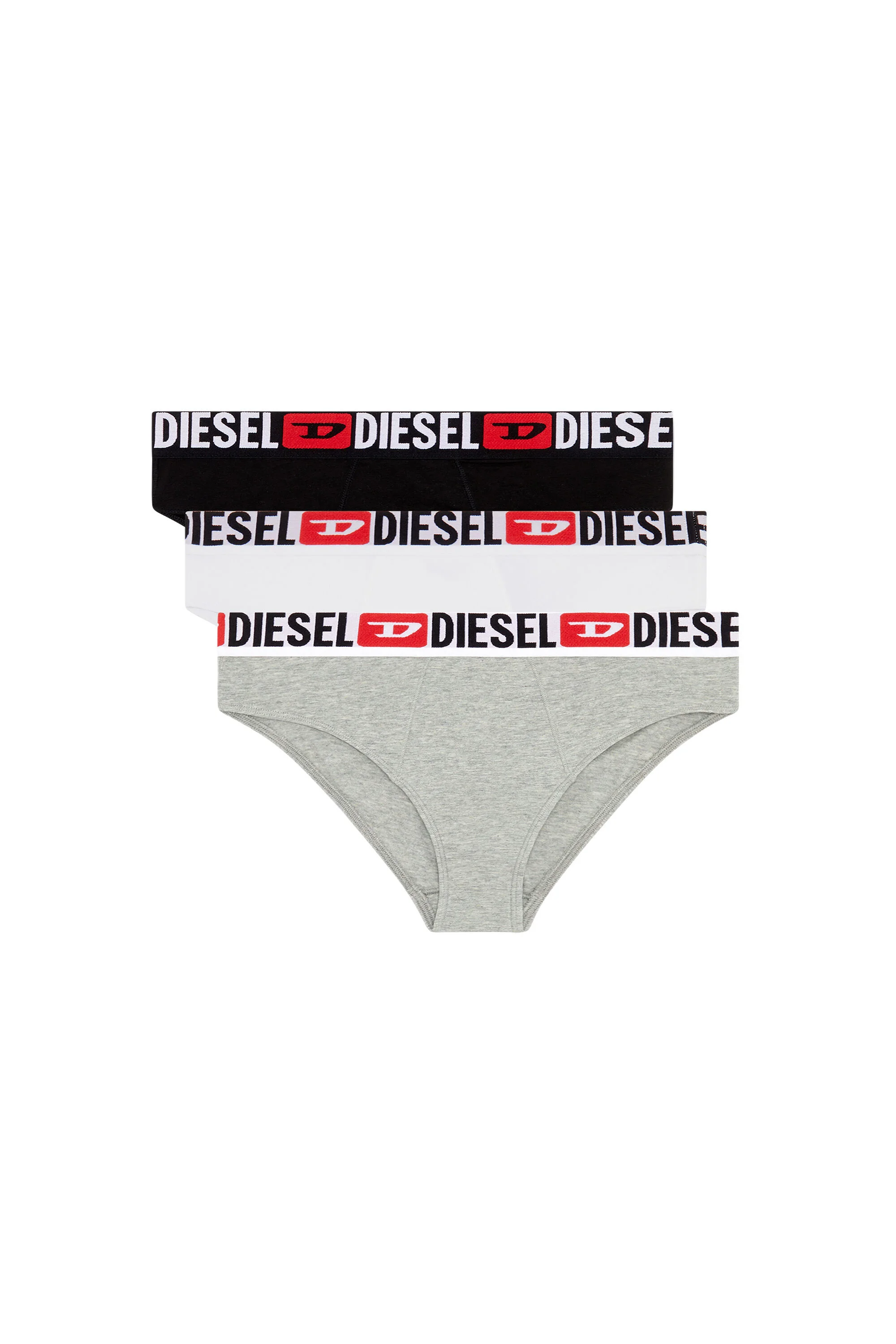 Product Description Three-pack of women's high-waisted briefs, crafted from ribbed stretch cotton. Inspired by men's styles with front stitching, they're topped with an all-over logo waistband. ID: A131240NJAP Size & Fit Model is wearing a size S and is 175 cm / 5'7'' Check the size chart to choose the correct size. Materials & Details Composition: 95%Cotton 5%Elastane-Spandex, Elastic 63%Polyamide-Nylon 28%Polyester 9%Elastane-Spandex By buying cotton products from Diesel, you’re supporting responsible cotton production through "Better Cotton”. Set of 3 pairs Elasticated logo waist