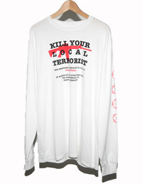 Disastr Wrld Kill Your Local Terrorist T-Shirt . Cool indie underground streetwear brand with a classic patriotic slogan. For the egglords out there. But this shirt is pretty dope so don't sleep Boyz n girlz. Shoulder to shoulder: 22' Pit to pit : 21.5' Shoulder to bottom : 30' Size: Large Material: Cotton Color: White *Measurements are approximate* All orders will be shipped the next day after payment is sent. For any questions feel free to message me.