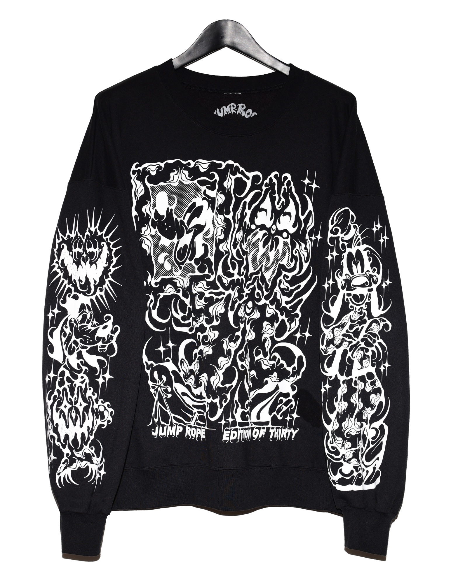 Jump Rope "Dancing In My Head" Crewneck Sold out, edition of 30, hand screen printed tee printed on a heavy cotton crewneck. By acclaimed tattoo artist Jump Rope studios. All his tees are handmade and sell out quick. Size XXL on tag Shoulder to shoulder : 27’ Pit to pit : 27’ Shoulder to bottom : 30’ Shoulder to cuff : 24.5’ *Measurements are approximate* *Most of these Garments are second hand, please determine the condition and any markings or wear based on the high res photos provided* All orders will be shipped the next day after payment is sent. For any questions feel free to message me.