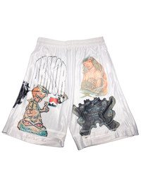 madeofglue Armor Armor Shorts NYC based DIY artist madeofglue 1 of 1 sublimation printed shorts. Printed on high quality North Gear basketball shorts. Size L on Tag Waist (measured all the way around) : 32’ Waist (Fully Stretched) : 45’ Waist to cuff : 22’ Inseam : 10.5’ Leg opening : 12’ *Measurements are approximate* *Most of these Garments are second hand unless stated otherwise, please determine the condition and any markings or wear based on the high res photos provided* All orders will be shipped the next day after payment is sent. For any questions feel free to message me.