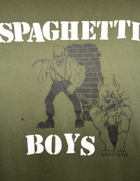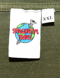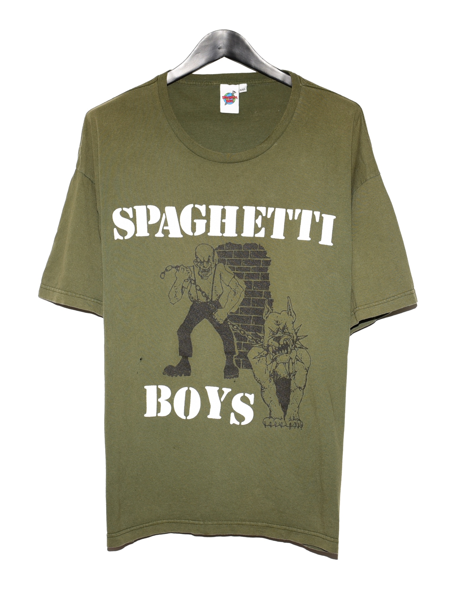 Spaghetti Boys Skinhead Tee A rare piece of NYC fashion history. One of the original Spaghetti Boys tees from 2014. Screen Printed on front and back a sick punk skinhead inspired design by Ray Martinez. Has 2-3 very small holes on front. For those unaware, Spaghetti Boys was a collective of young artists that formed in the early 2010s that included the likes of Asspizza, Kerwin Frost, Luka Sabbat, Ray Martinez, White Trash Tyler, Father Steve and affiliated with many more like Will Mahony of Haveagreatday magazine and Lamour Supreme of Mishka. This wave of streetwear ushered in a new genre of streetwear that birthed brands like Warren Lotas, Billy Hill, Haunted Starbucks, kentuckyboytyler and so many others. Size XXL on tag Shoulder to shoulder : 27’ Pit to pit : 24.5’ Shoulder to bottom : 28’ Shoulder to cuff : 9’ *Measurements are approximate* *Most of these Garments are second hand unless stated otherwise, please determine the condition and any markings or wear based on
