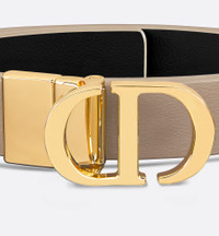 Inspired by the hallmark namesake bag, the 30 Montaigne belt is offered in a reversible variation, thanks to its swivel mechanism. Crafted in hazelnut smooth calfskin on one side and black smooth calfskin on the other, it is embellished with the iconic CD buckle in shiny gold-finish metal. The design also features two removable loops that can be worn in a tonal or contrasting fashion. The timeless accessory elegantly highlights the waist and will coordinate well with jeans, a skirt or a dress. - 30 Montaigne CD buckle - Shiny gold-finish metal detailing - Two removable loops - 95% calfskin, 5% brass - Made in Italy Size & Fit - Width: 20 mm / 0.8 inch - Buckle dimensions: 4 x 2.5 cm / 1.5 x 1 inches (Length x Height) - Using our personalized tool will provide you with the best size recommendation - For more information, please review the size guide