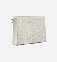The A5 triangle pouch is a House staple. The style is made in beige Dior Gravity Outline leather, a grained calfskin embossed with the iconic House motif for a 3D effect with graphic appeal, and is enhanced by the Dior signature on the front. Its spacious zip compartment is perfect for a phone and is completed by six card slots. Thanks to its removable grained calfskin wrist strap, the pouch can be carried by hand or slipped into a bag, and will pair well with other Dior Gravity Outline creations. - Main composition: calfskin - Calfskin and technical fabric lining - Main zip compartment - Interior slip pocket - Six card slots in grained calfskin - Removable grained calfskin wrist strap - Ruthenium-finish brass Dior signature on the front - Embossed Dior signature on the interior - Dust bag included - Made in Italy/Spain Size & Fit - Dimensions: 27 x 19 x 6.5 cm / 10.5 x 7.5 x 2.5 inches (Length x Height x Width) - The main compartment's size is suitable for all phones - Weight: 460 g / 16 ounces - Size and weight details may vary depending on the product's material