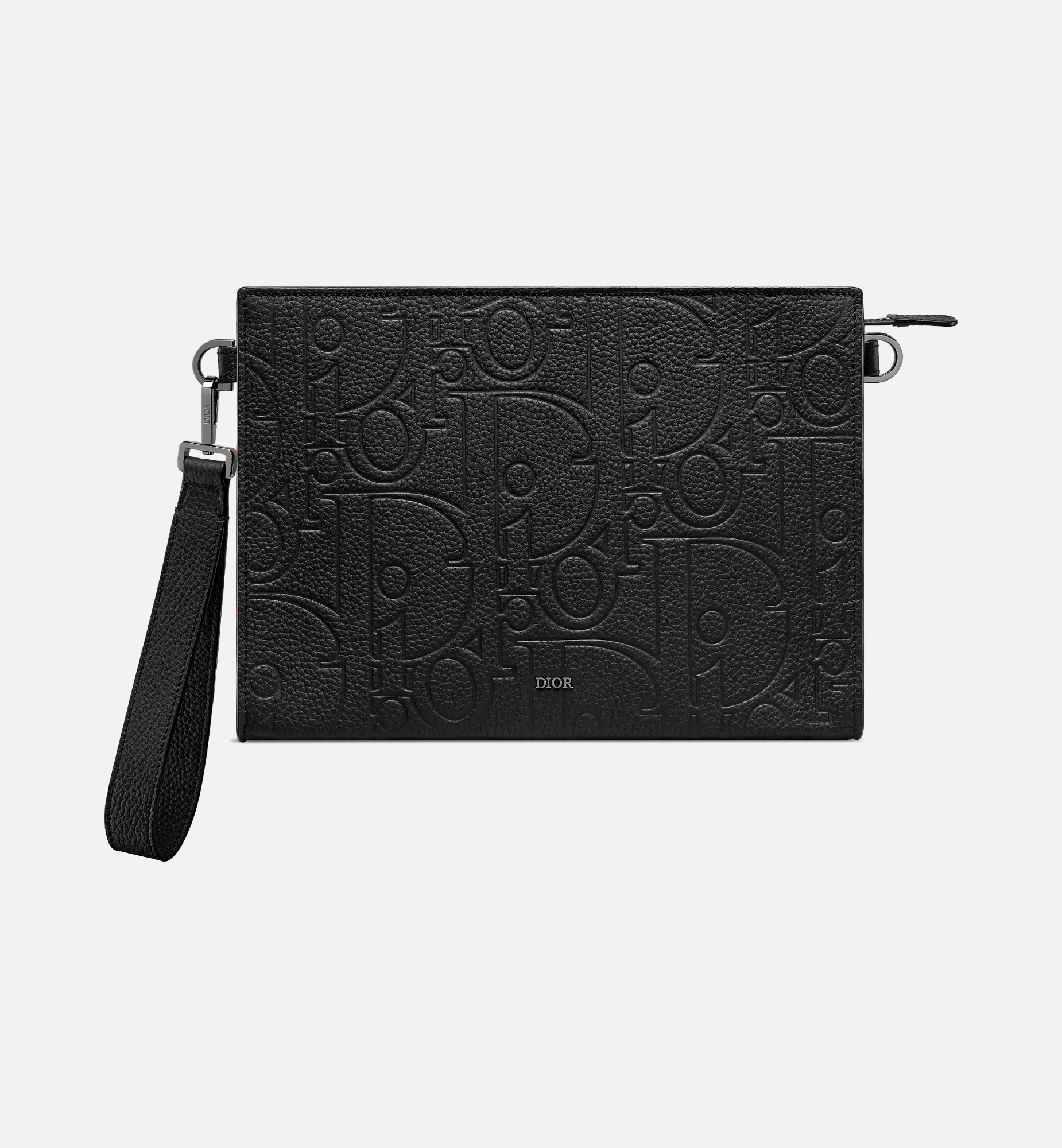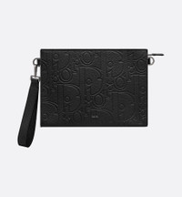 The pouch is a House staple. Displaying the virtuosity of the House ateliers, the Dior Gravity leather showcases the iconic motif delicately embossed on black calfskin with a Dior signature on the front. The spacious zip compartment is ideal for a phone and features six card slots. Thanks to its removable grained calfskin wrist strap, the pouch can be carried by hand or slipped into a bag. - Cotton interior - Interior slip pocket - Six card slots in grained calfskin - Removable grained calfskin wrist strap with lobster clasp - Ruthenium-finish brass Dior signature on front - Interior embossed with Dior signature - Dust bag included - Made in Italy/Spain Size & Fit - Dimensions: 27 x 19.5 x 6 cm / 10.5 x 7.5 x 2.5 inches (Length x Height x Width) - The main compartment's size is suitable for all phones - Weight: 490 g / 17.5 ounces