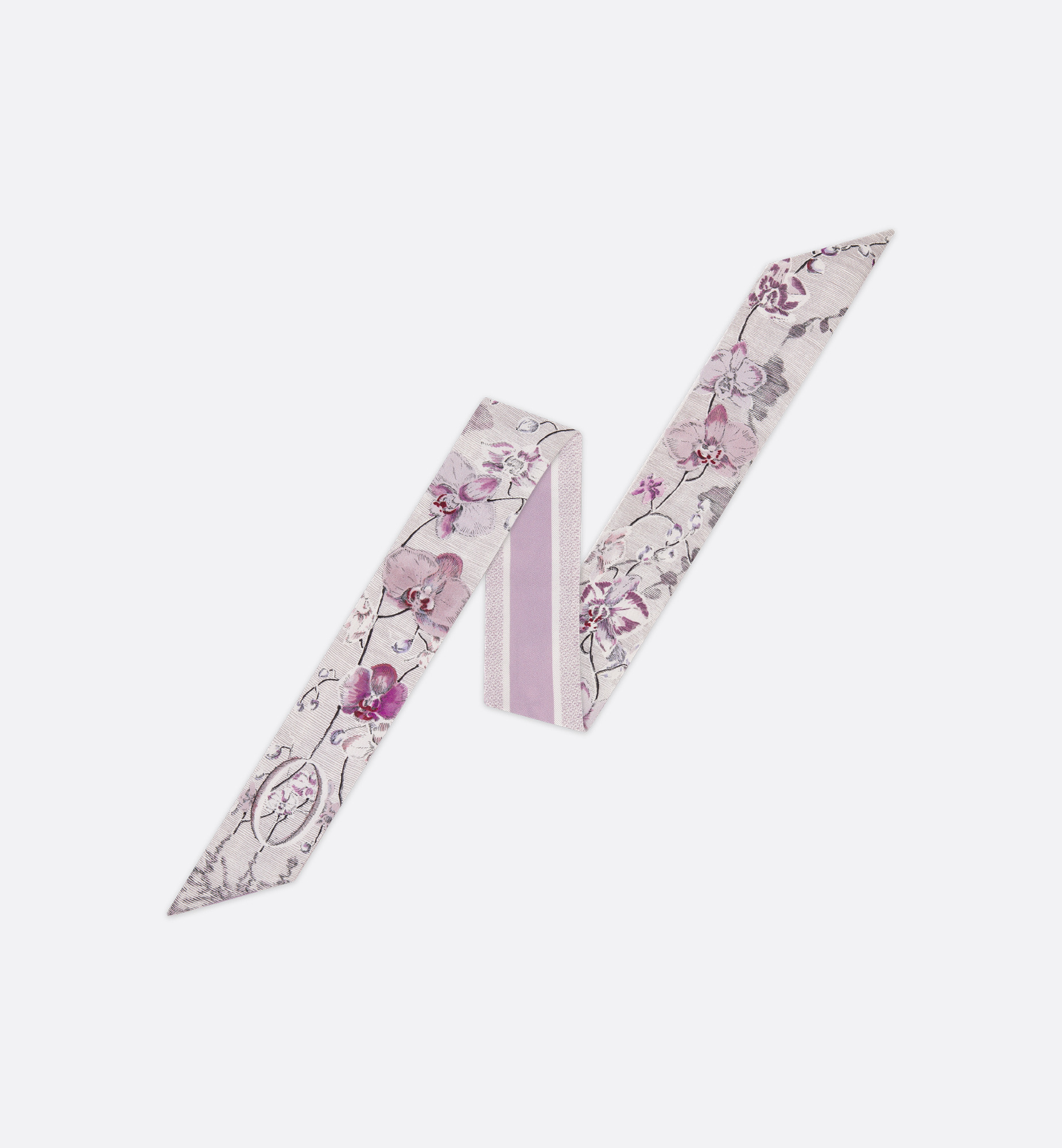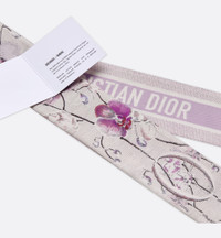 The ABCDior Mitzah scarf, crafted in silk twill, showcases one of 26 flowers that represent Christian Dior's love of nature. A passion that flourishes like never before upon Maria Grazia Chiuri's delicate creations in a celebration of botanical beauty. Delicate orchids appear and disappear between fine lines, as if in an infinite play of shadows. Enhanced by a contrasting Christian Dior signature jacquard band on the back, the ivory multicolor Mitzah scarf adds the finishing touch to any look and may be tied around the neck, at the wrist or on a bag. - ABCDior print - Letter O Orchidee - Ombre - Contrasting jacquard band with Christian Dior signature on back - Pointed ends - 100% silk twill - Made in Italy - Sold with leaflet Size & Fit - Dimensions: 6 x 105 cm / 2.5 x 41.5 inches