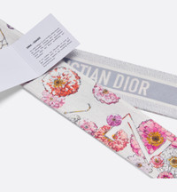 The ABCDior Mitzah scarf, crafted in silk twill, showcases one of 26 flowers that represent Christian Dior's love of nature. A passion that flourishes like never before upon Maria Grazia Chiuri's delicate creations in a celebration of botanical beauty. A sun bathes the silhouettes of more or less distant stars in a dazzling light. Constellations appear, like twinkling flowers that twirl around. Enhanced by a contrasting Christian Dior signature jacquard band on the back, the ivory multicolor Mitzah scarf adds the finishing touch to any look and may be tied around the neck, at the wrist or on a bag. - ABCDior print - Letter Z Zinnia - Zodiaque - Contrasting jacquard band with Christian Dior signature on back - Pointed ends - 100% silk twill - Made in Italy - Sold with leaflet Size & Fit - Dimensions: 6 x 105 cm / 2.5 x 41.5 inches