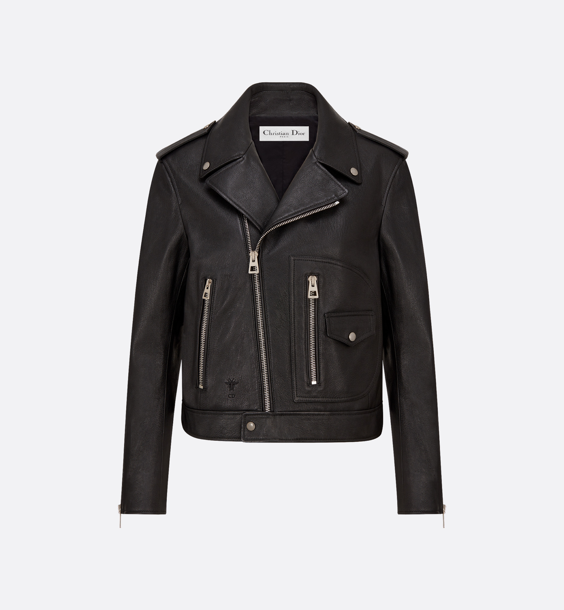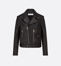The black biker jacket is a timeless piece, updated by Maria Grazia Chiuri. Crafted in supple goatskin, it presents a fitted silhouette with multiple zip closures and a notched collar with snap buttons. Featuring shoulder pads, an asymmetric front zipped closure, two zipped pockets and a small snap-button pocket, the biker jacket will highlight any outfit year-round. - Embroidered bee emblem - Front off-center zip closure - Zip cuffs - Tonal lining - 100% goatskin - Made in Italy Size & Fit - Fitted silhouette - Back length: 50 cm / 19.5 inches (size 36) - Long sleeves - For more information, please review the size guide